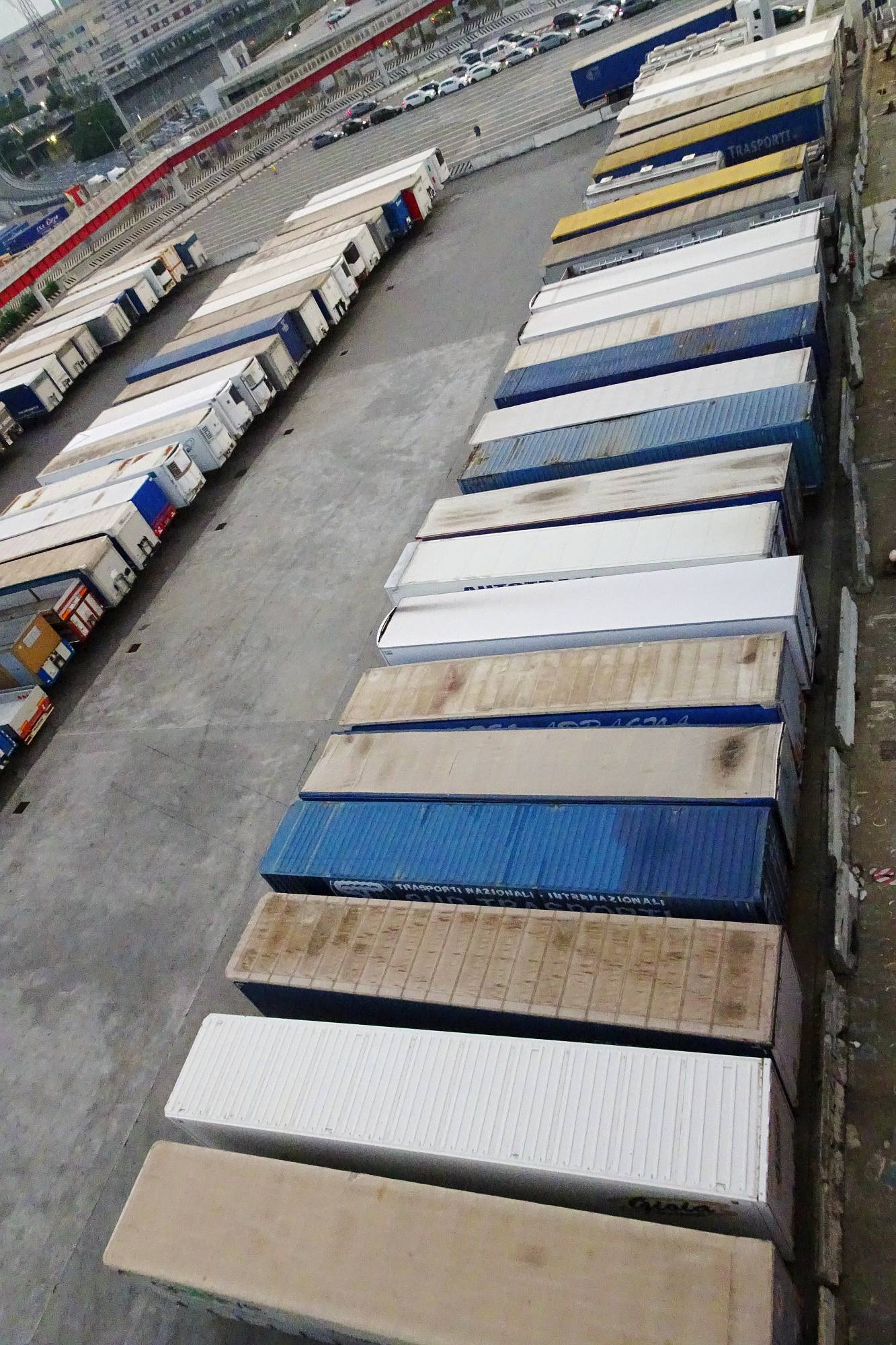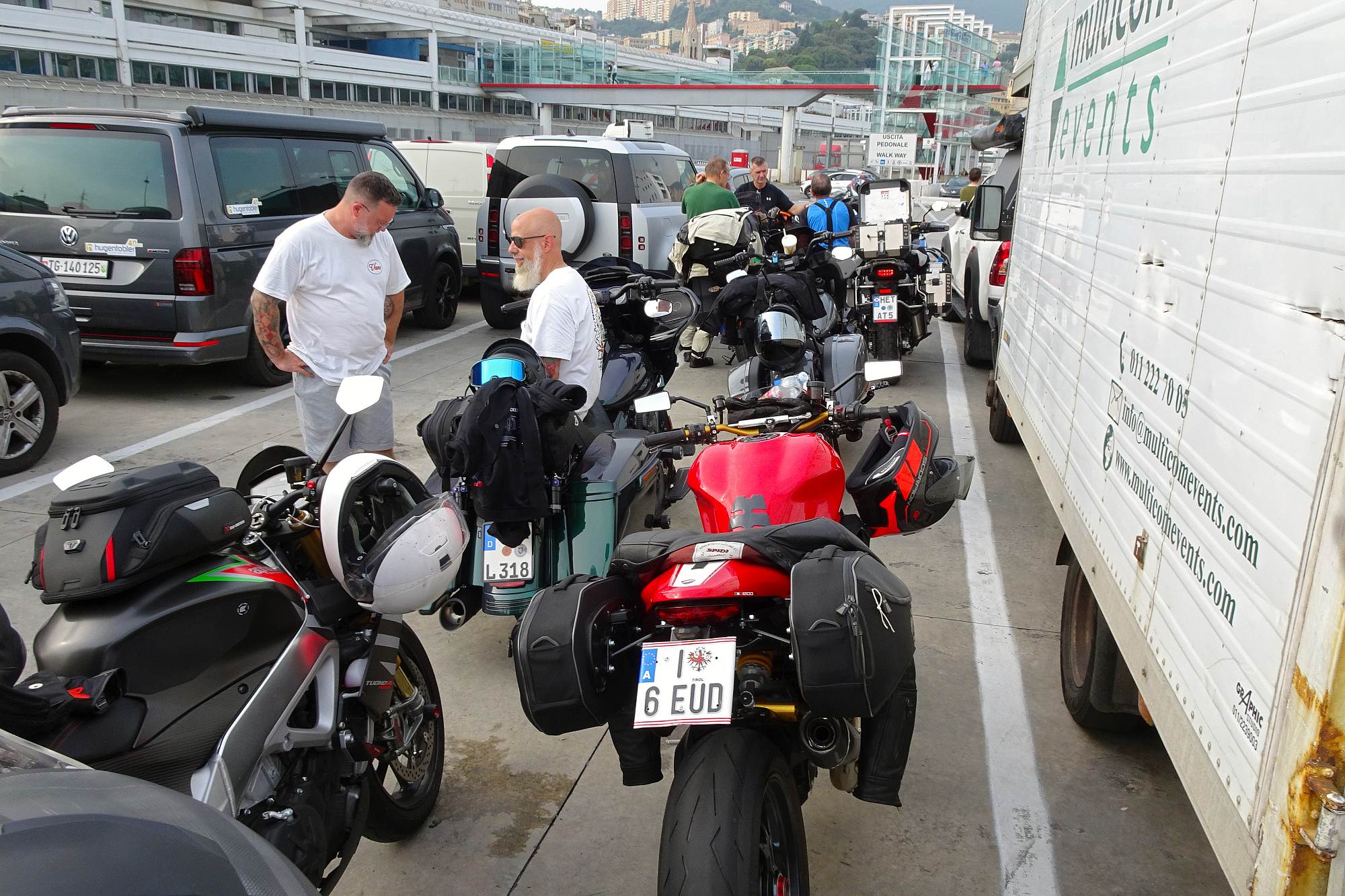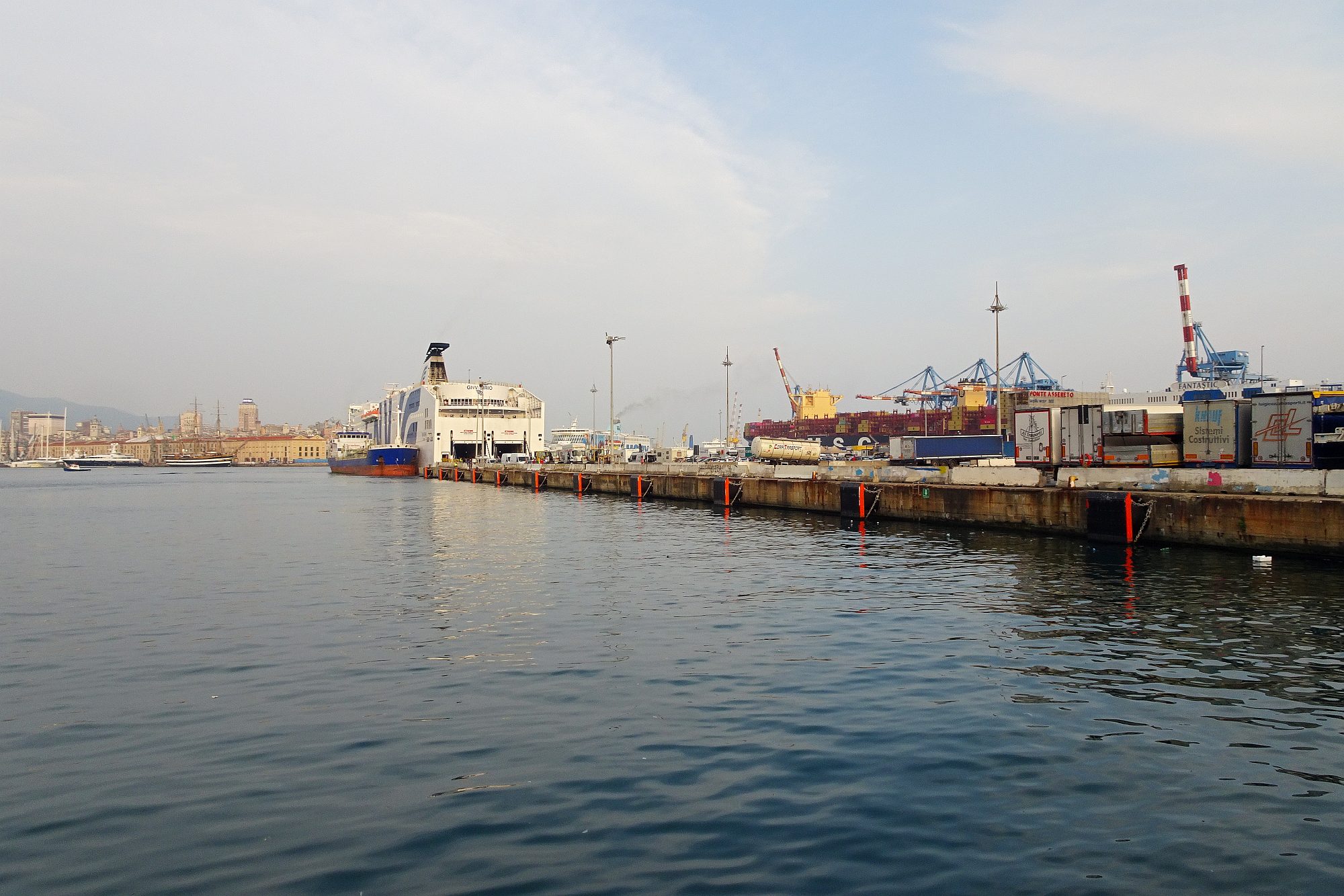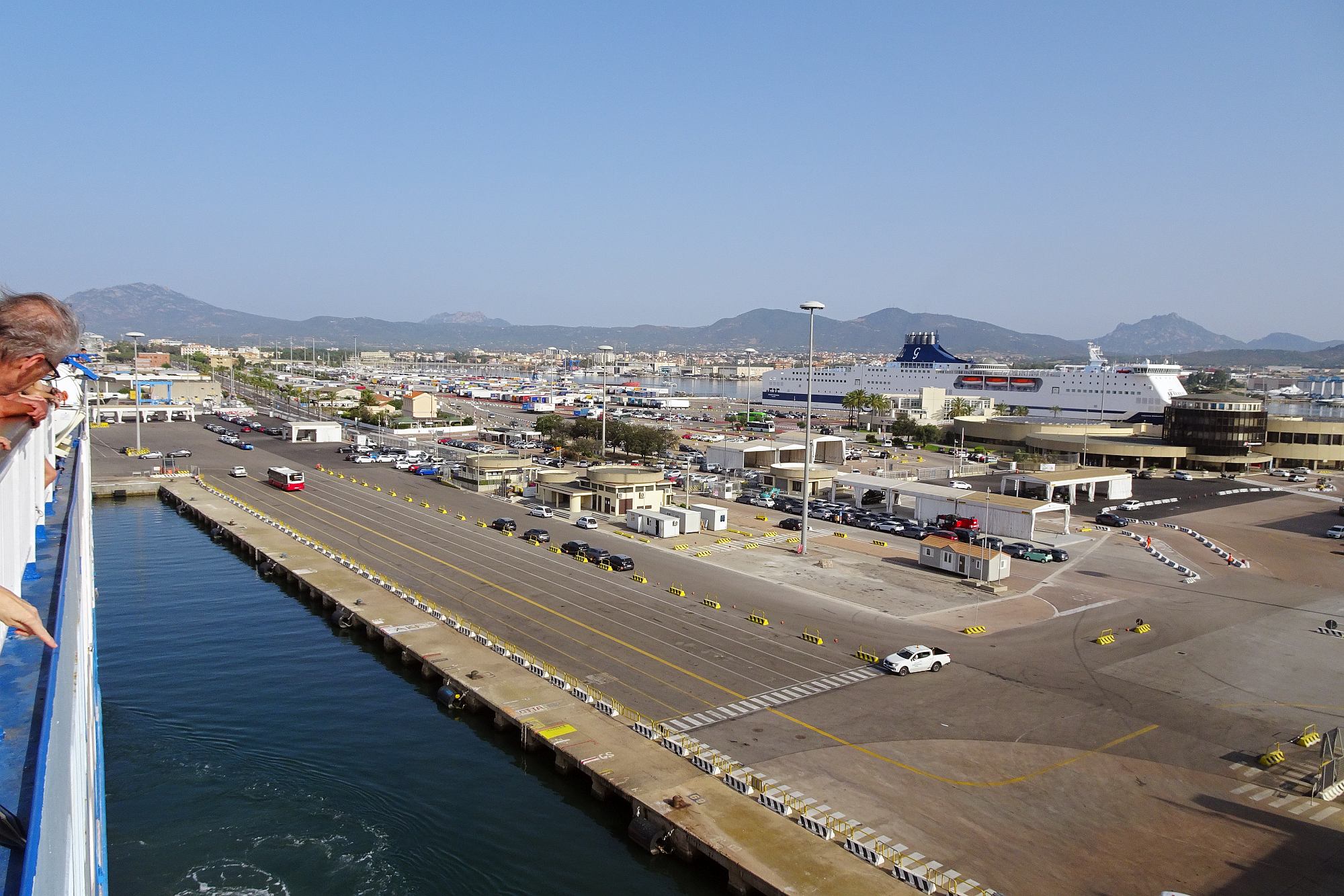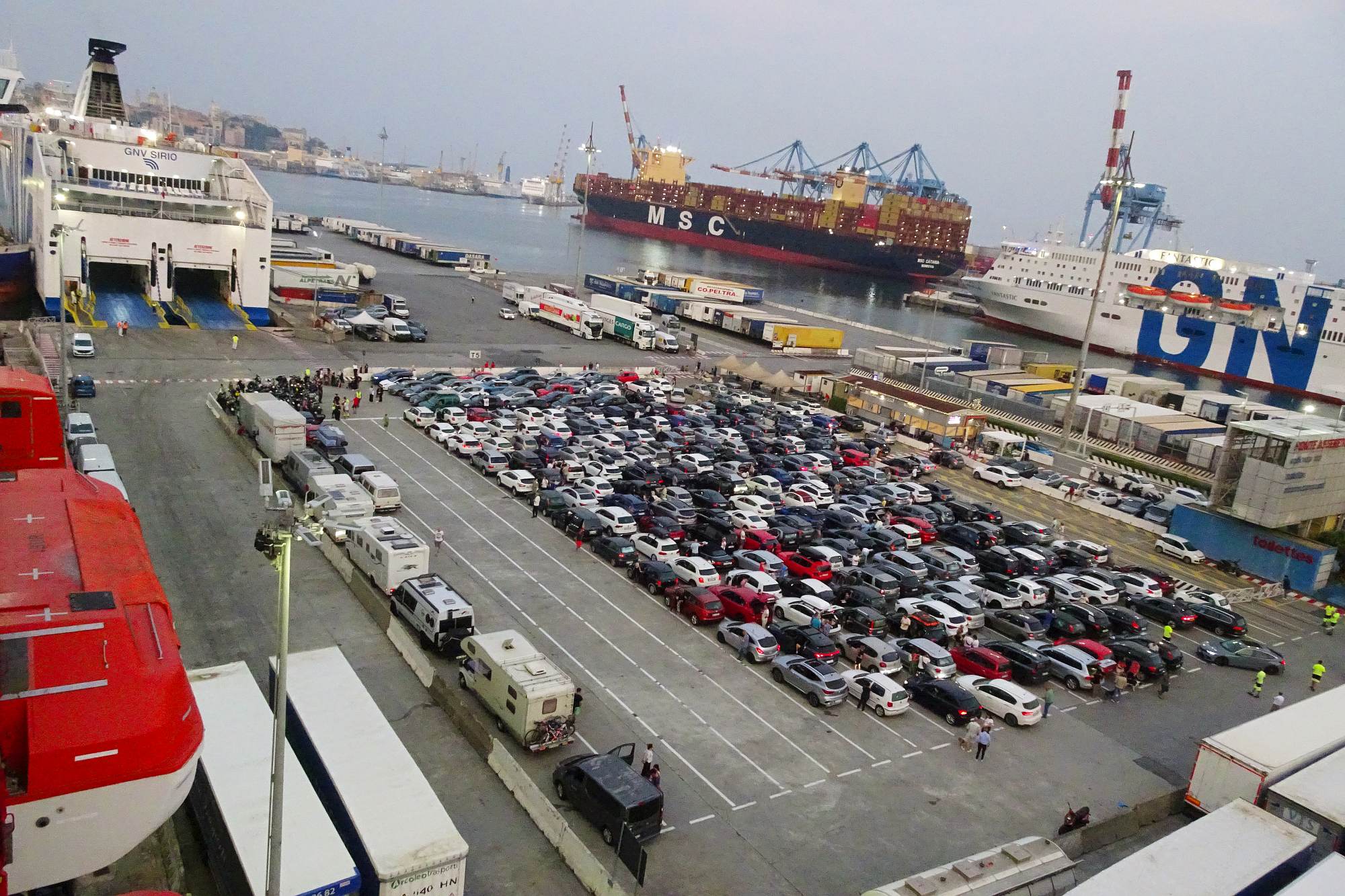 Nur noch ein kurzer Sprung in der Nachmittagshitze und schon standen wir im Fährhafen von Genova. Hier freilich mussten wir noch über 2 Stunden in der Abendsonne darauf warten, dass die Fähre endlich anlegt und wir an Bord durften. Aber trotzdem, obwohl wir schon unzählige Male mit Fährschiffen unterwegs waren – es ist doch jedes Mal ein tolles Erlebnis, wenn man dann hoch oben an Deck steht und auf die Hafenanlage und die anderen Schiffe hinunterblicken kann.