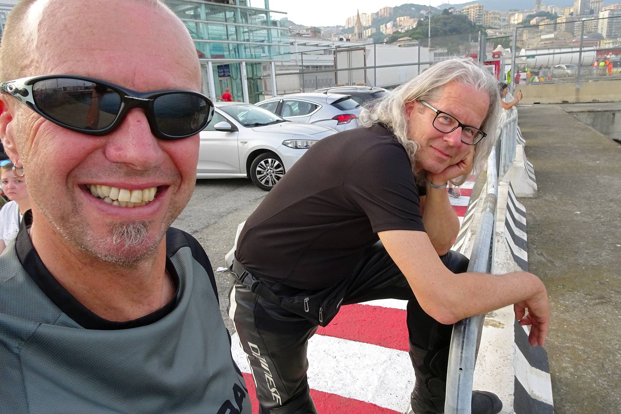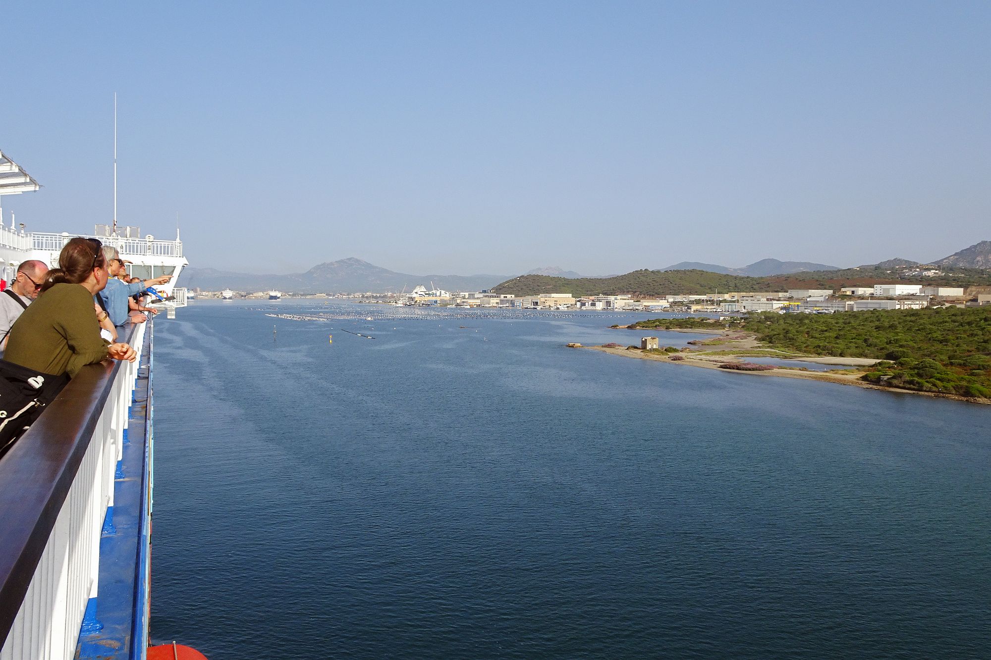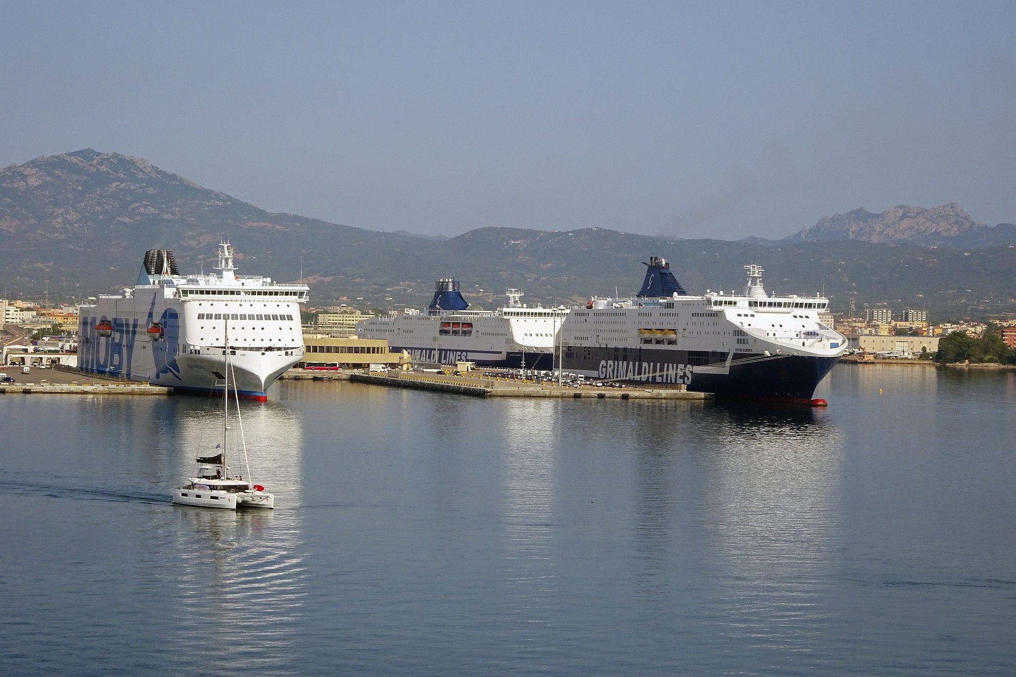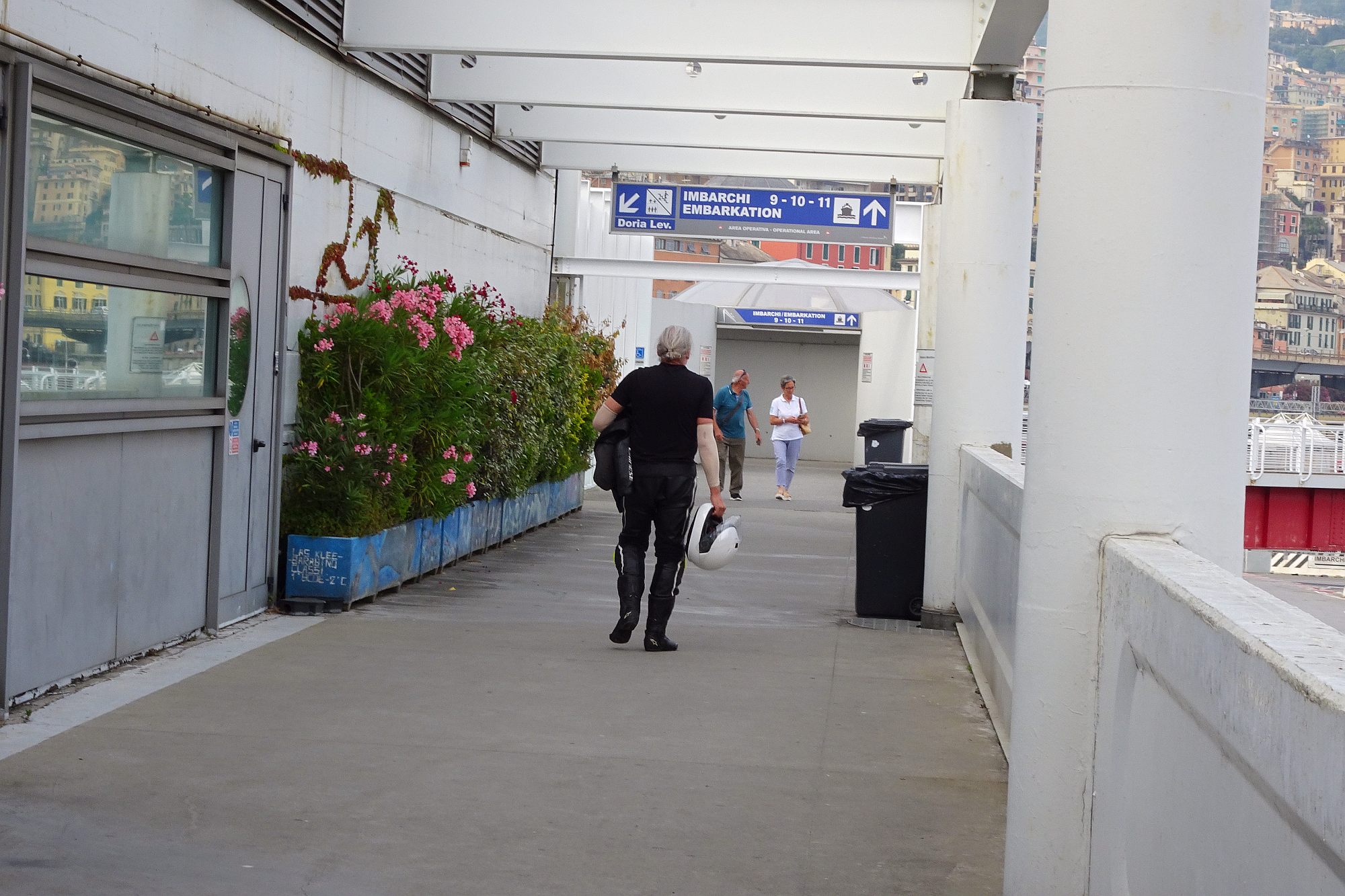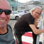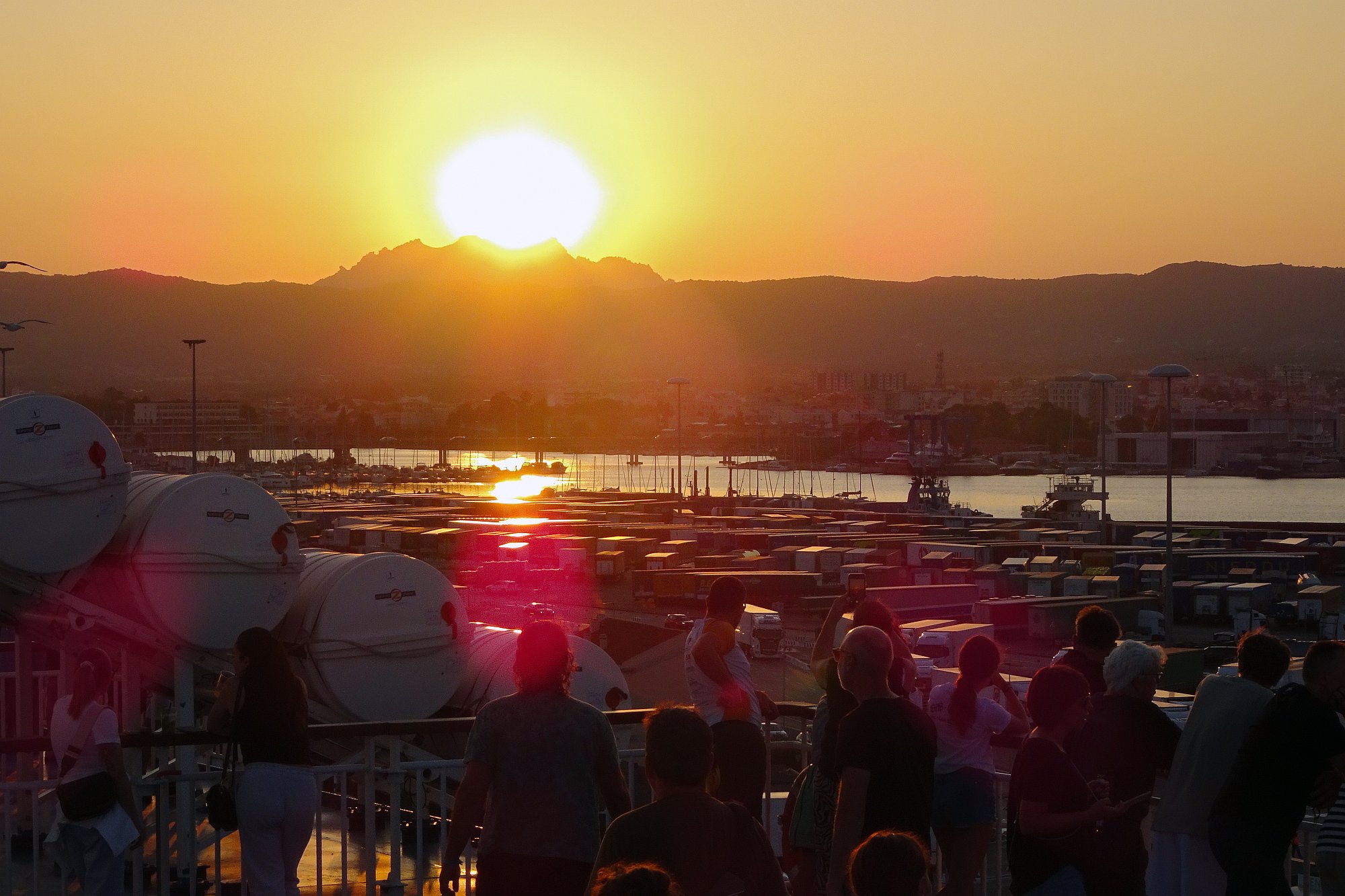 Nur noch ein kurzer Sprung in der Nachmittagshitze und schon standen wir im Fährhafen von Genova. Hier freilich mussten wir noch über 2 Stunden in der Abendsonne darauf warten, dass die Fähre endlich anlegt und wir an Bord durften. Aber trotzdem, obwohl wir schon unzählige Male mit Fährschiffen unterwegs waren – es ist doch jedes Mal ein tolles Erlebnis, wenn man dann hoch oben an Deck steht und auf die Hafenanlage und die anderen Schiffe hinunterblicken kann.