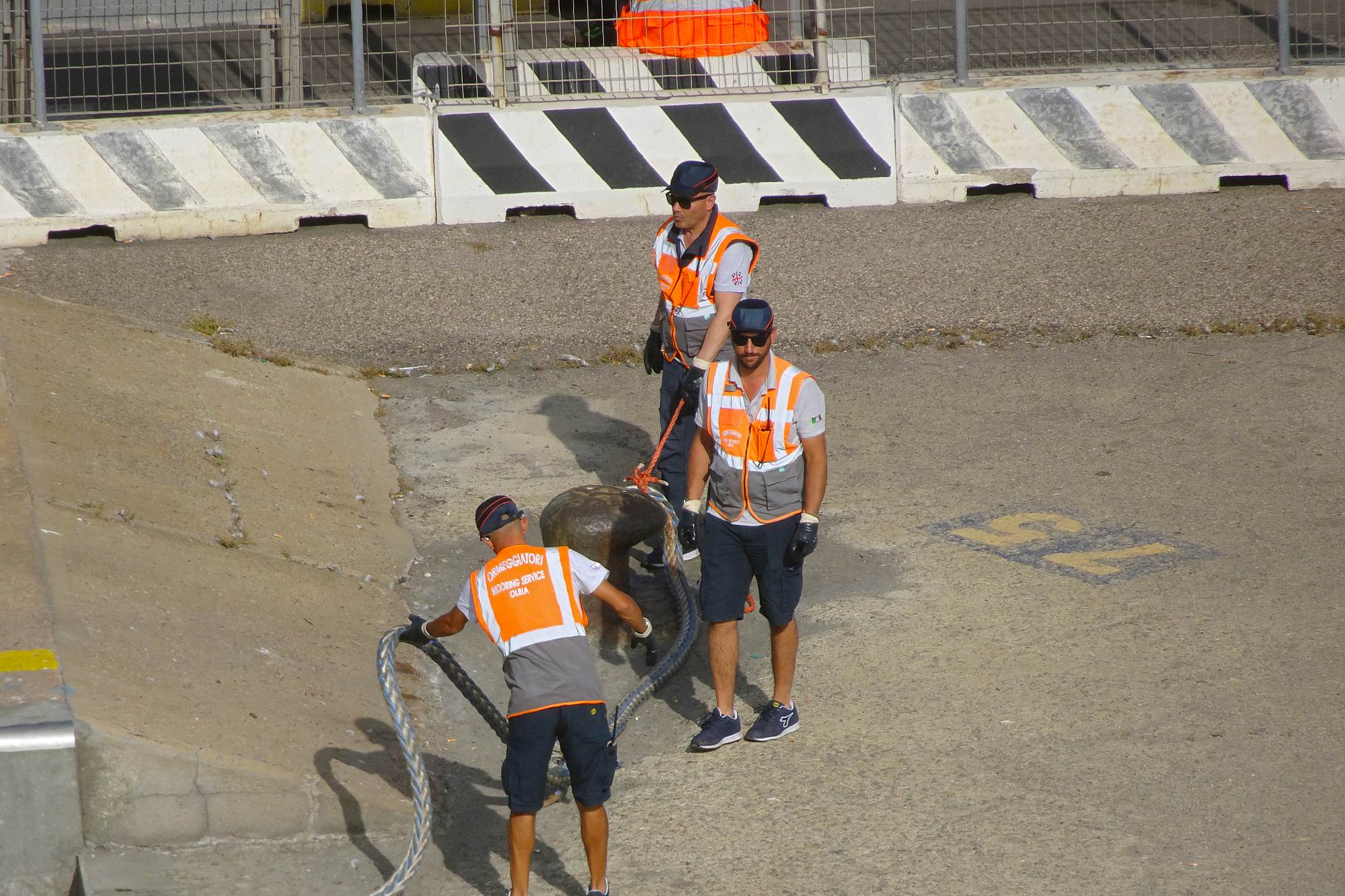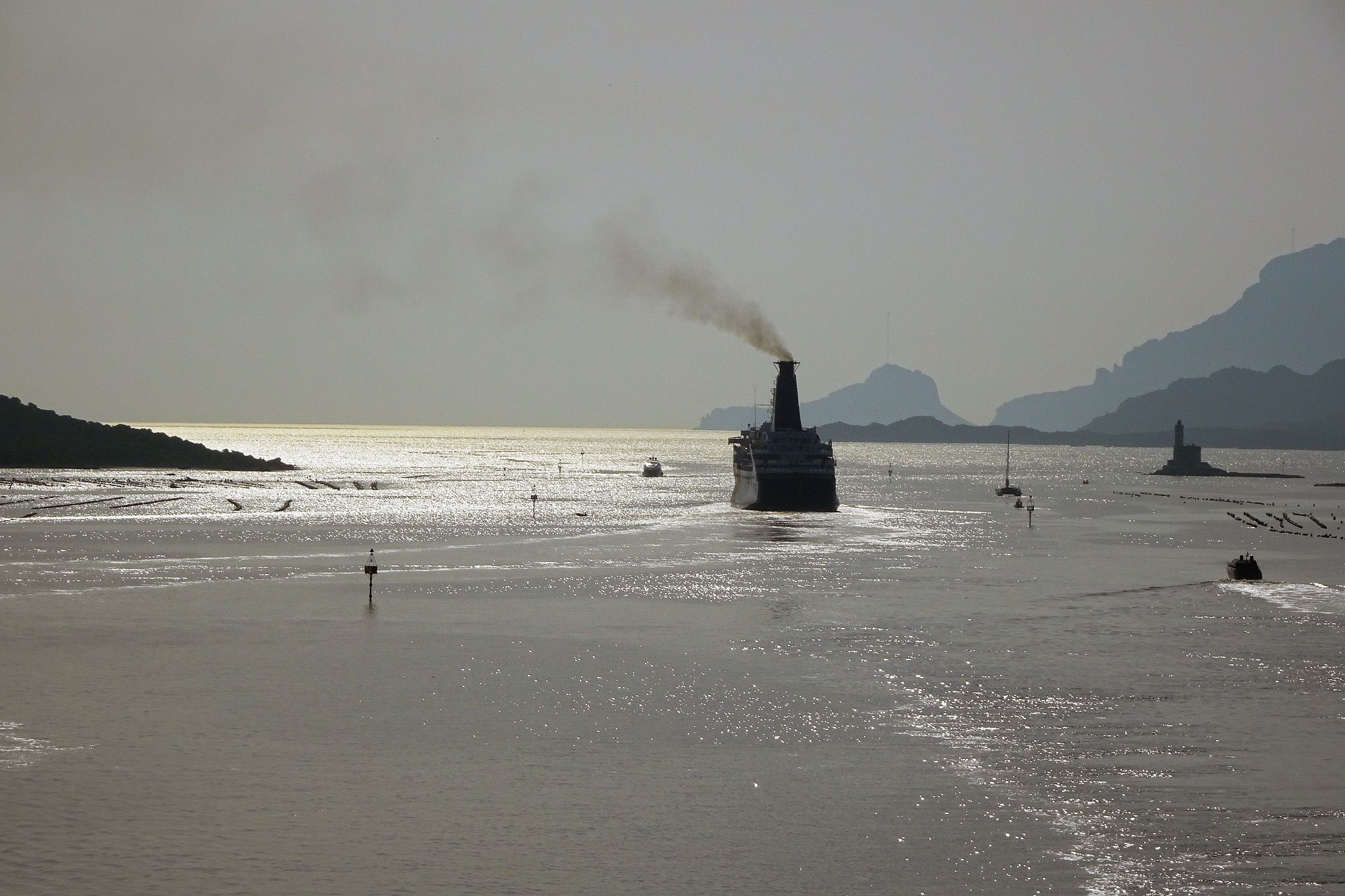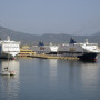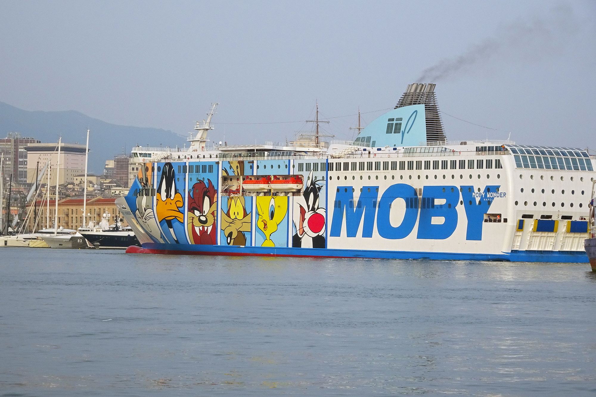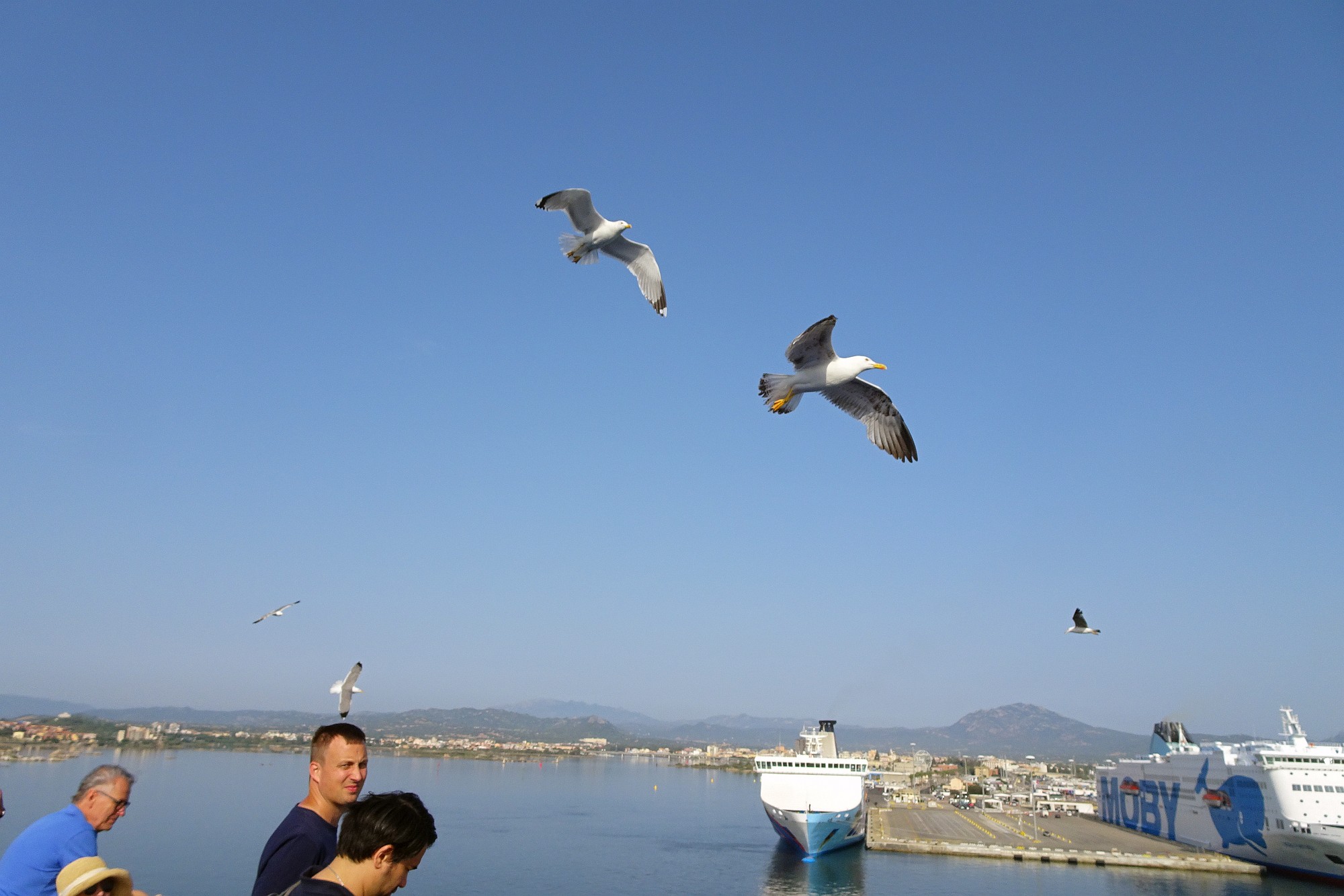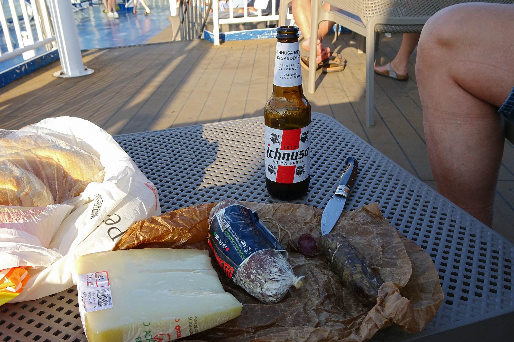 Nur noch ein kurzer Sprung in der Nachmittagshitze und schon standen wir im Fährhafen von Genova. Hier freilich mussten wir noch über 2 Stunden in der Abendsonne darauf warten, dass die Fähre endlich anlegt und wir an Bord durften. Aber trotzdem, obwohl wir schon unzählige Male mit Fährschiffen unterwegs waren – es ist doch jedes Mal ein tolles Erlebnis, wenn man dann hoch oben an Deck steht und auf die Hafenanlage und die anderen Schiffe hinunterblicken kann.