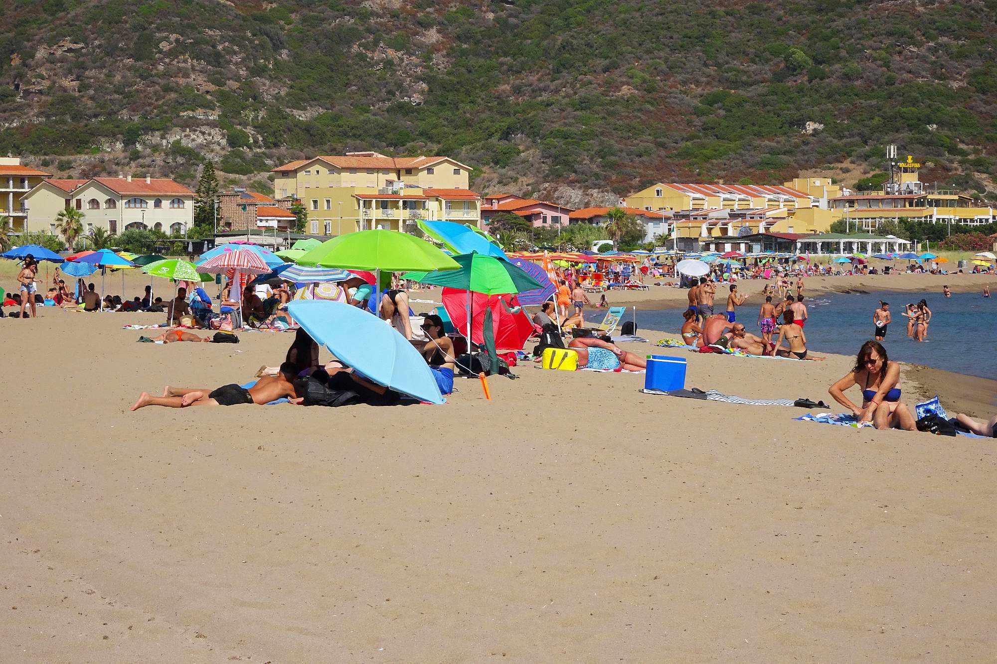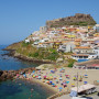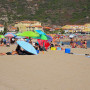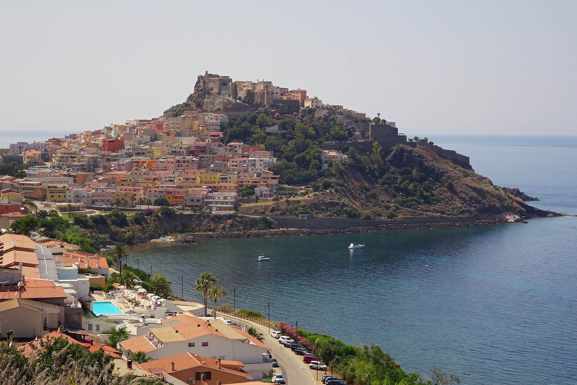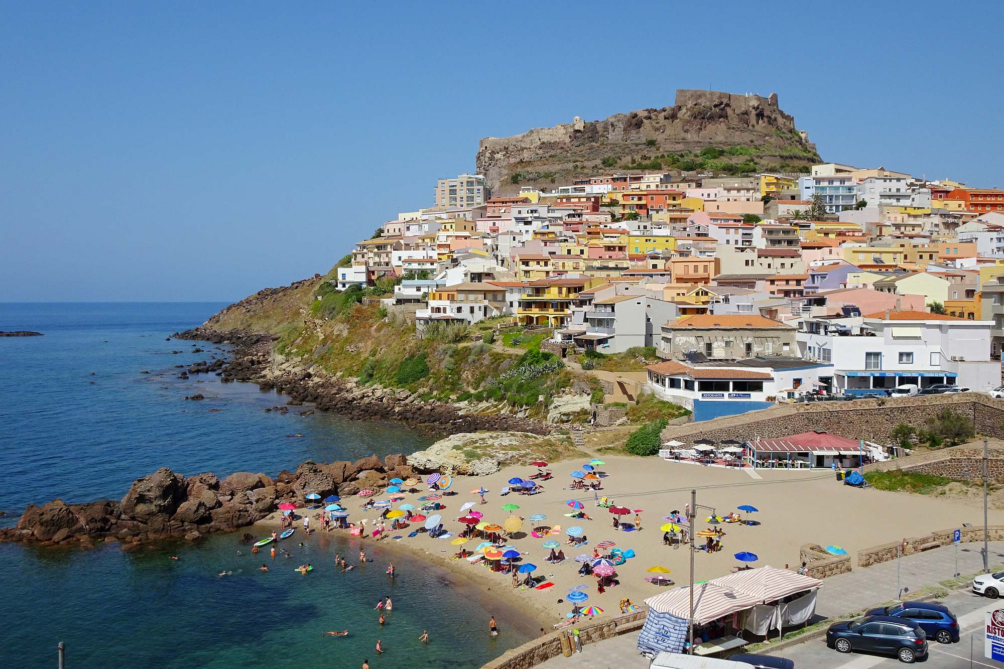 Da unsere Kondition langsam nachließ und wir nicht Lust hatten, noch ewig herumzufahren, wählten wir als heutiges Ziel die kleine Stadt Castelsardo, die malerisch auf einem Felsen am Meer liegt. Bei näherer Betrachtung entpuppte sich zwar auch dieser Ort als typisch sardisch – wenig einladende Architektur, eher kahle Gestaltung – aber der kleine Strand direkt vor unserem Hotel war natürlich der Hit!