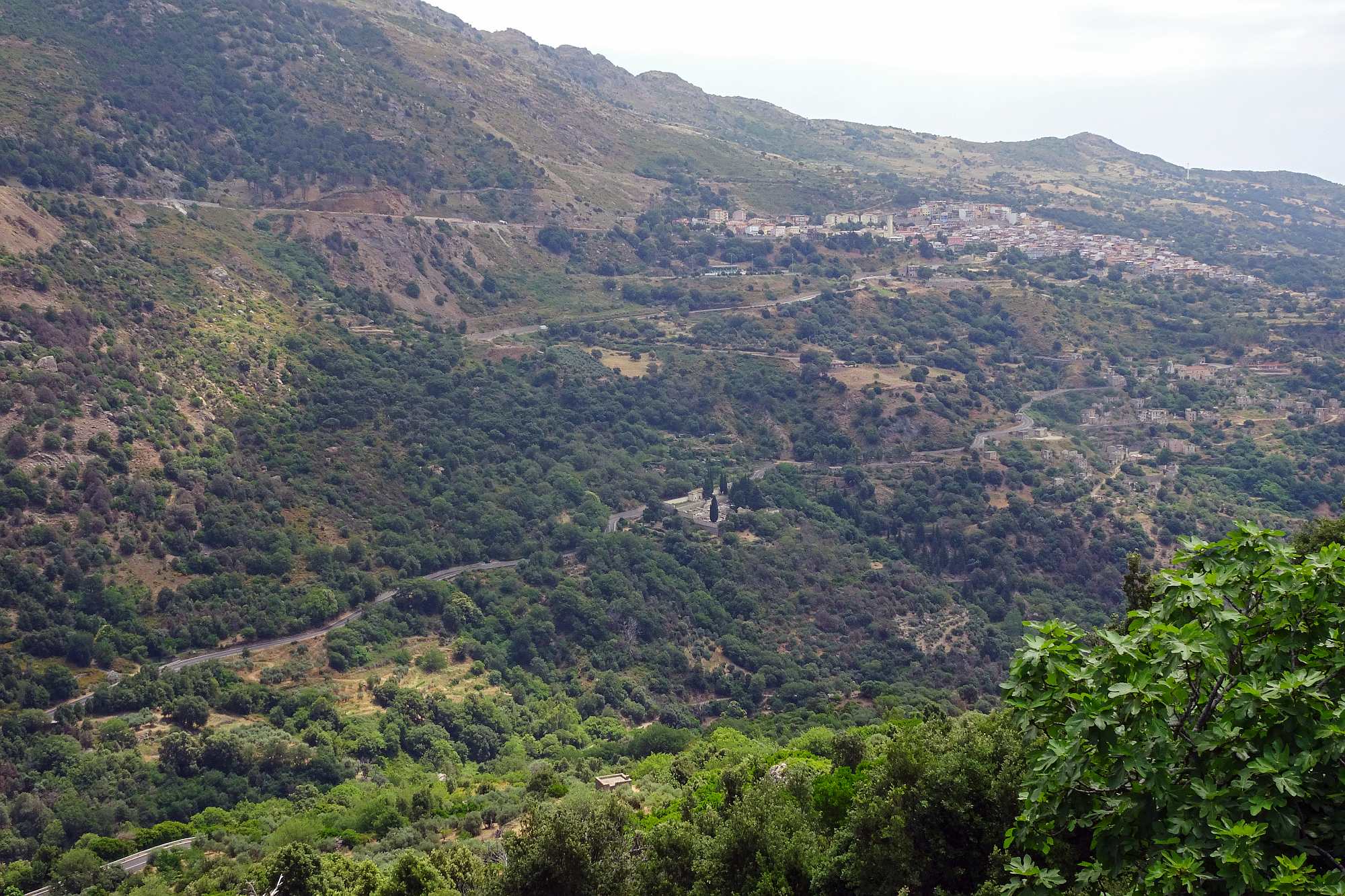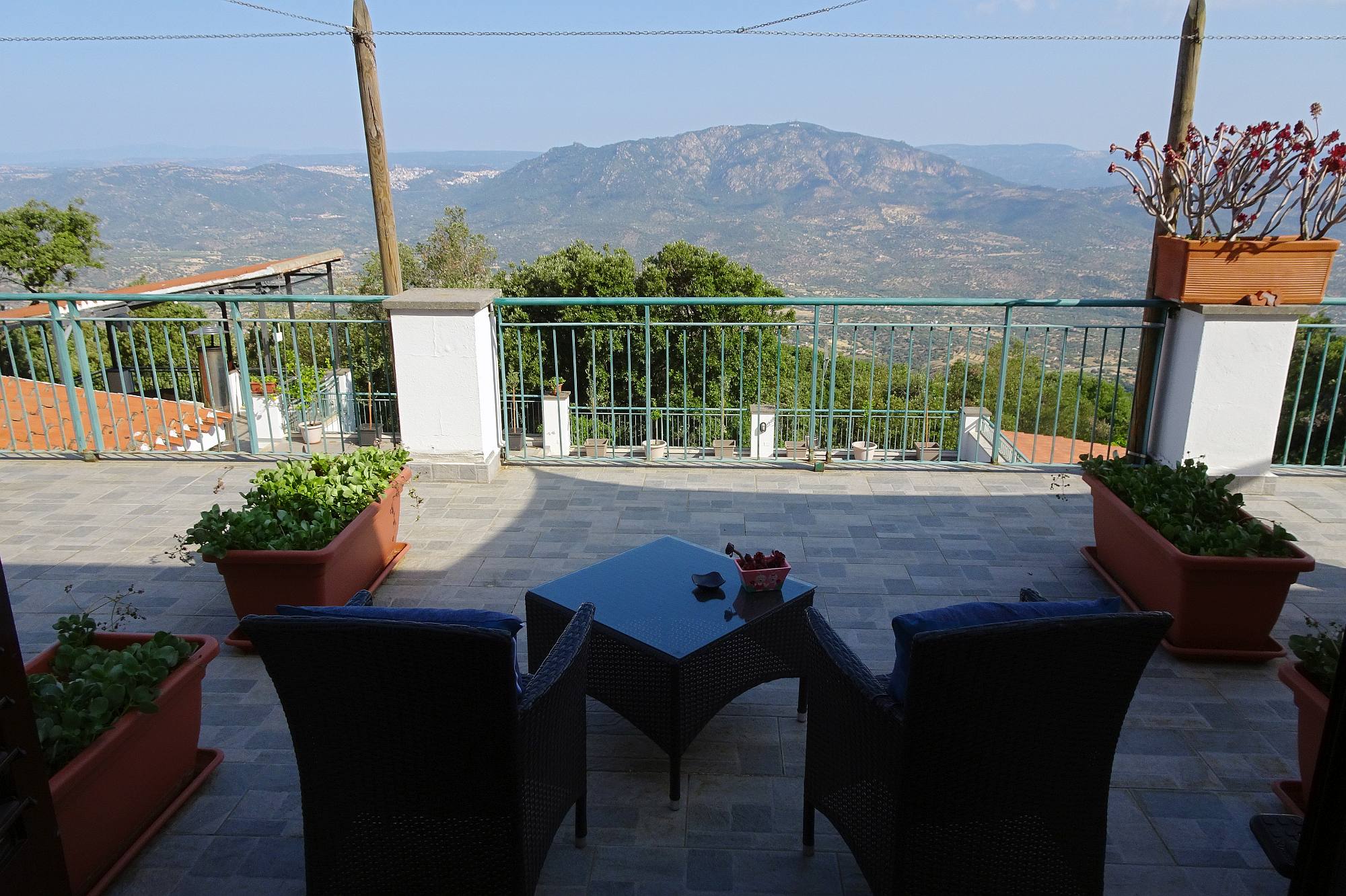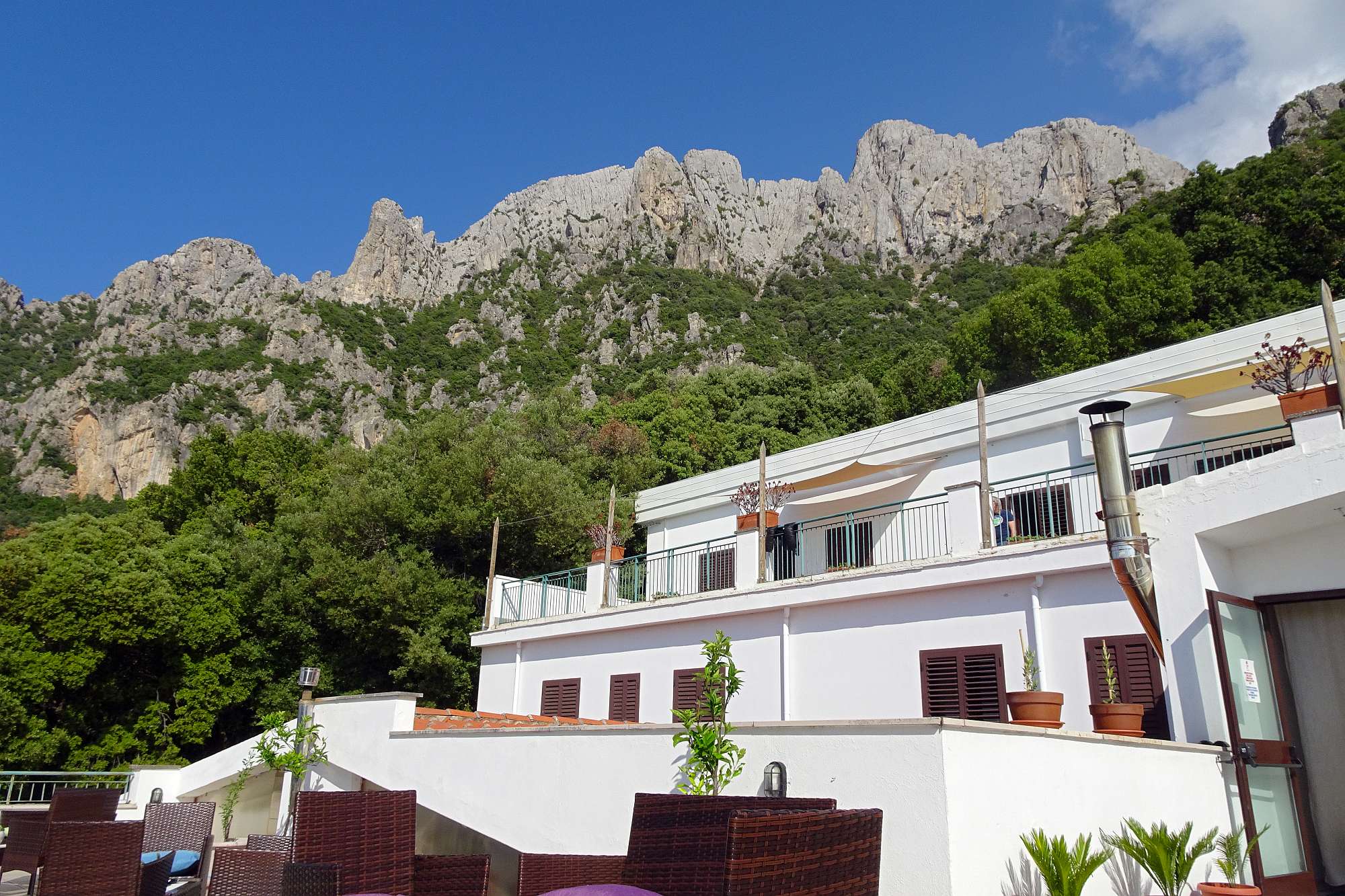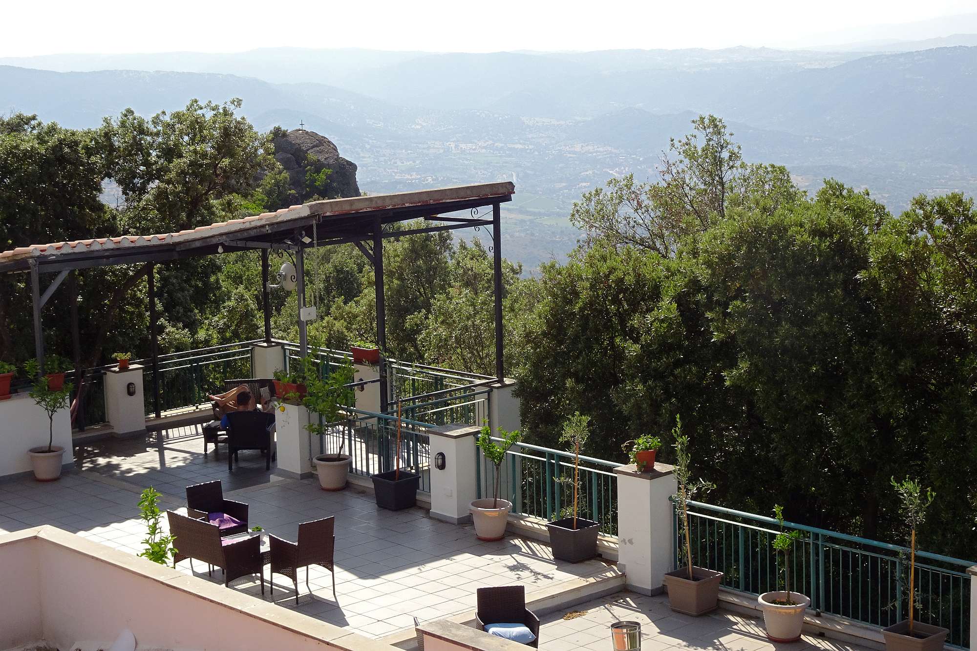 Am Ende in unserem Zielörtchen Oliena wartete freilich noch eine Überraschung auf uns: Das gebuchte Hotel lag keineswegs im Ort, sondern etwa 250 m höher am Hang des Supramonte und die Auffahrt bestand aus einer alten, teilweise ausgewaschenen Betonrampe mit gefühlt 20 Serpentinen. Dafür erwartete uns ein wirklich gemütliches Hotel mit Terrassen, nicht überlaufen, mit viel Wald rundherum und einer grandiosen Aussicht.