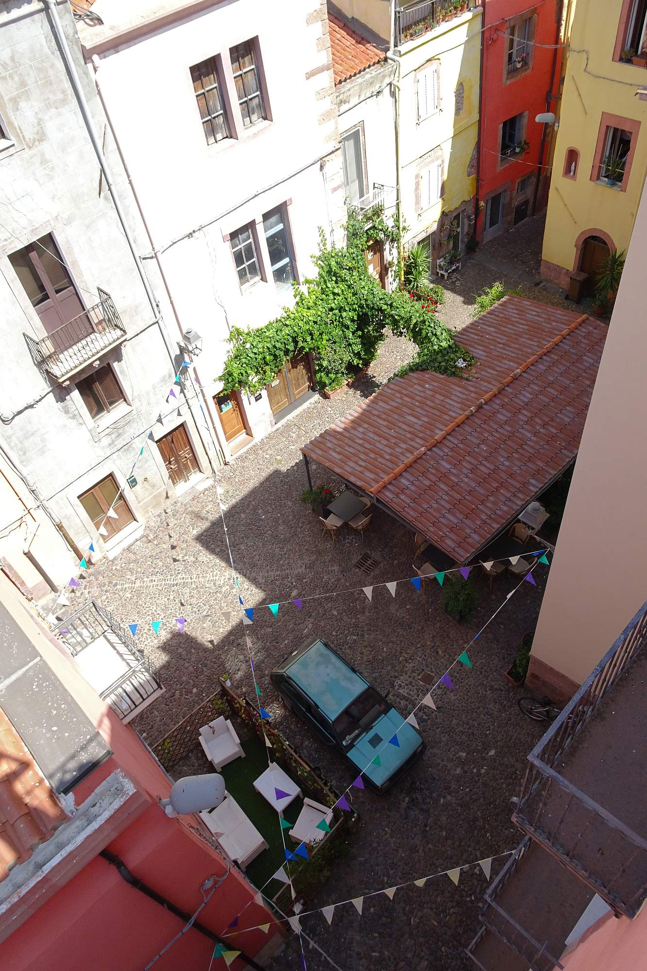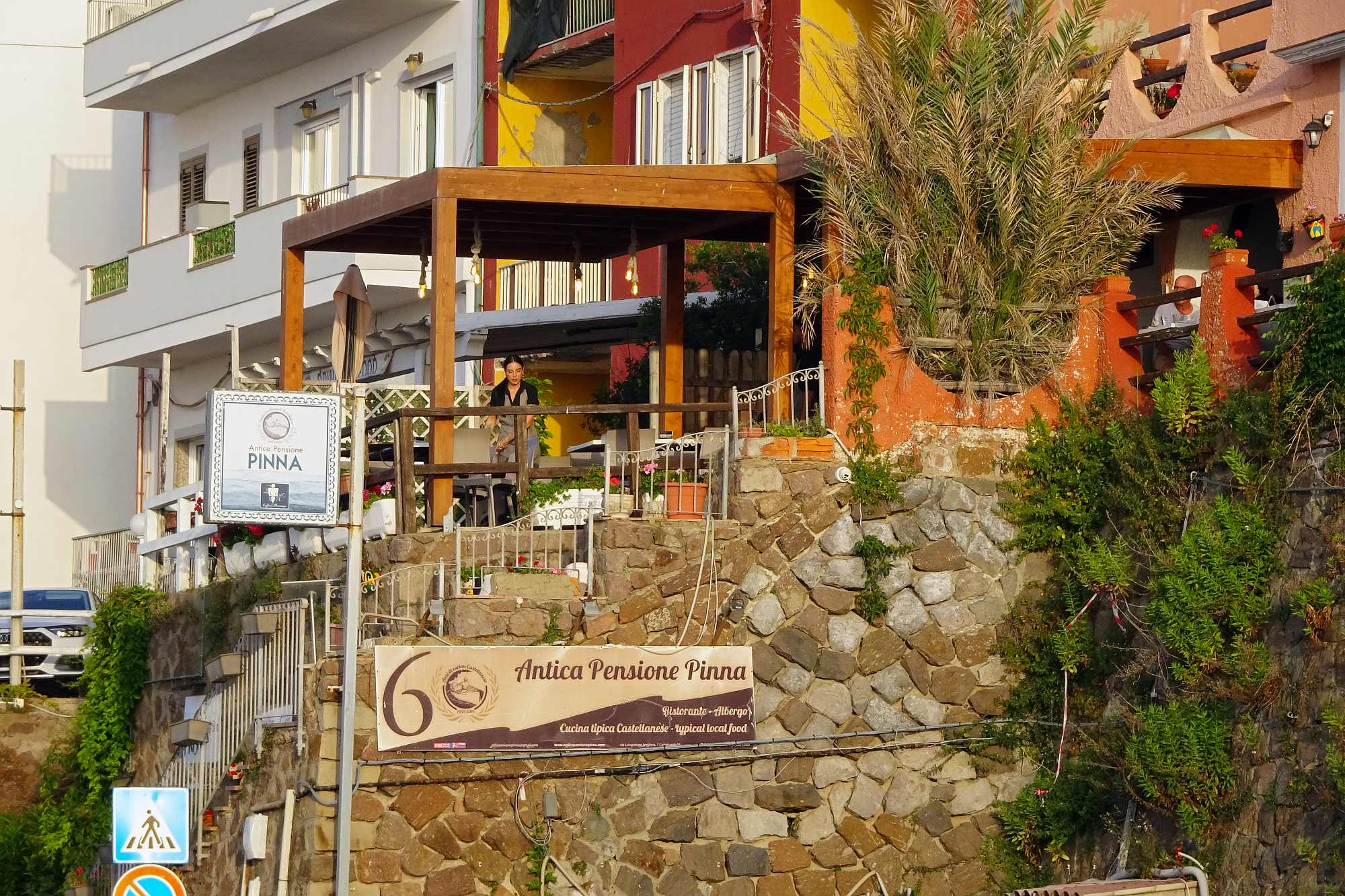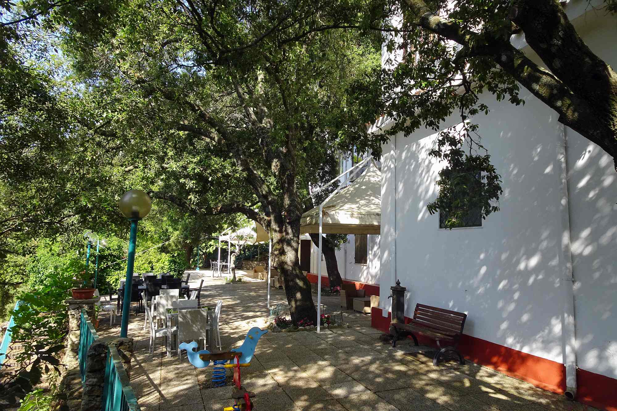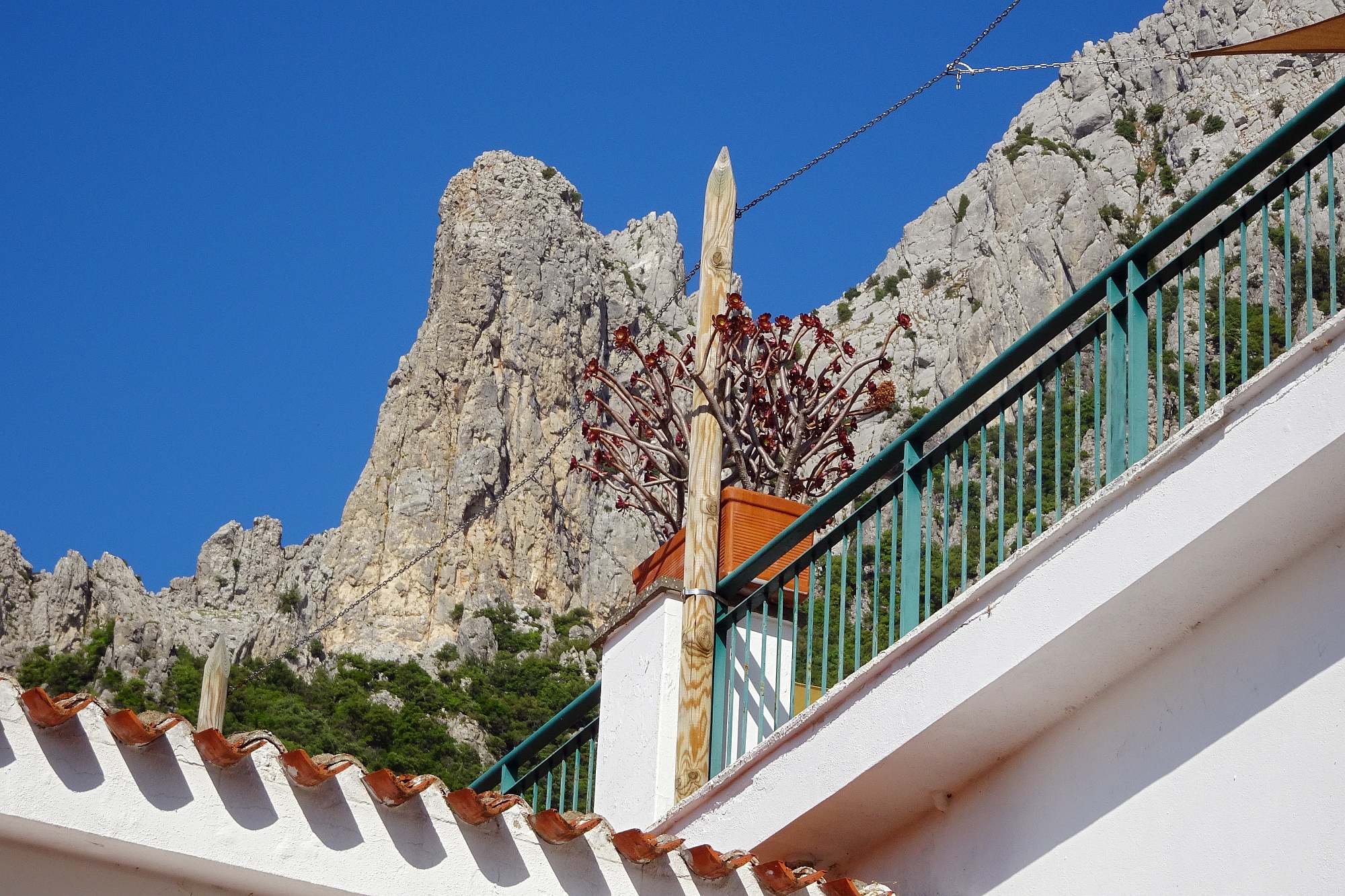 Am Ende in unserem Zielörtchen Oliena wartete freilich noch eine Überraschung auf uns: Das gebuchte Hotel lag keineswegs im Ort, sondern etwa 250 m höher am Hang des Supramonte und die Auffahrt bestand aus einer alten, teilweise ausgewaschenen Betonrampe mit gefühlt 20 Serpentinen. Dafür erwartete uns ein wirklich gemütliches Hotel mit Terrassen, nicht überlaufen, mit viel Wald rundherum und einer grandiosen Aussicht.