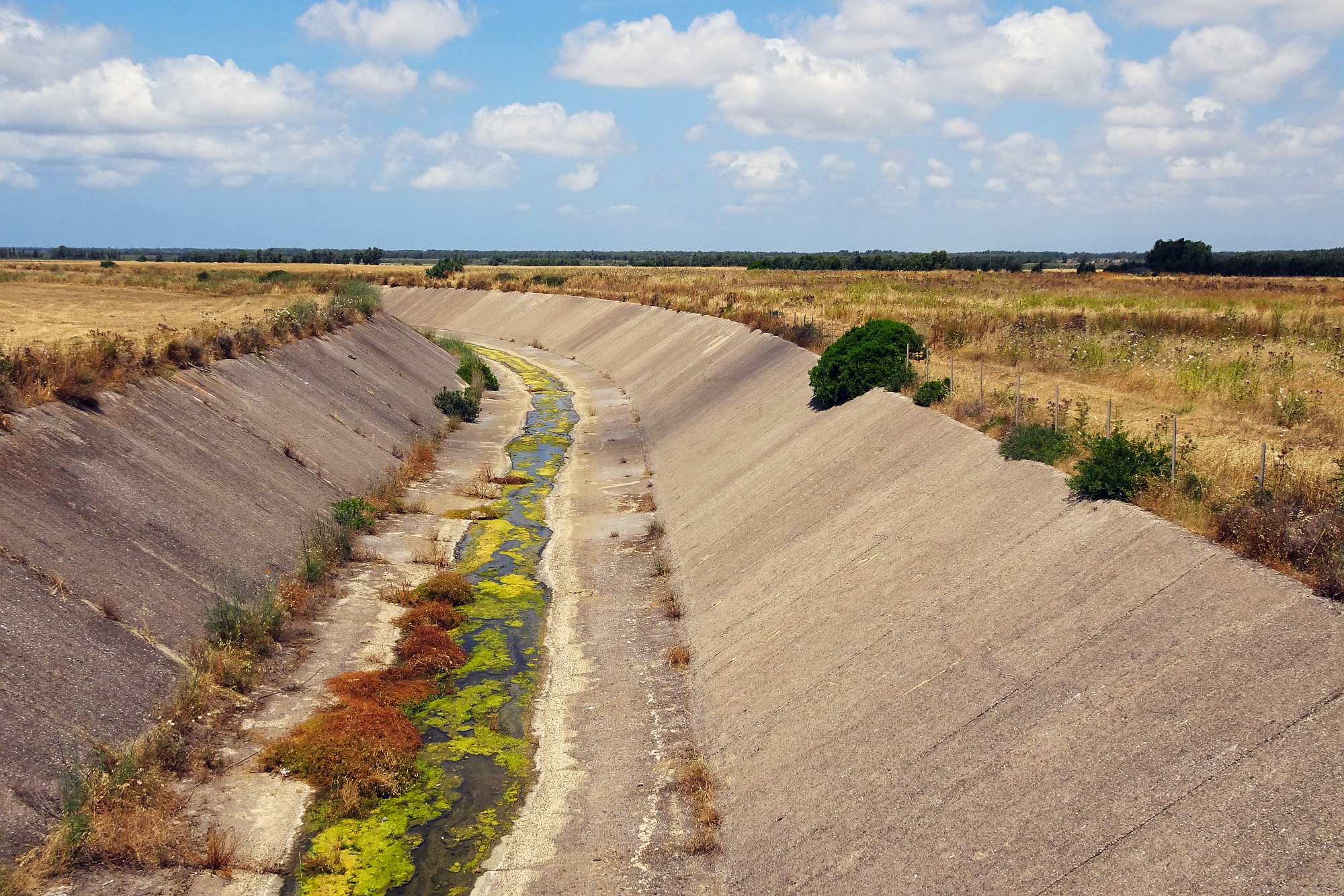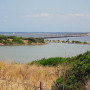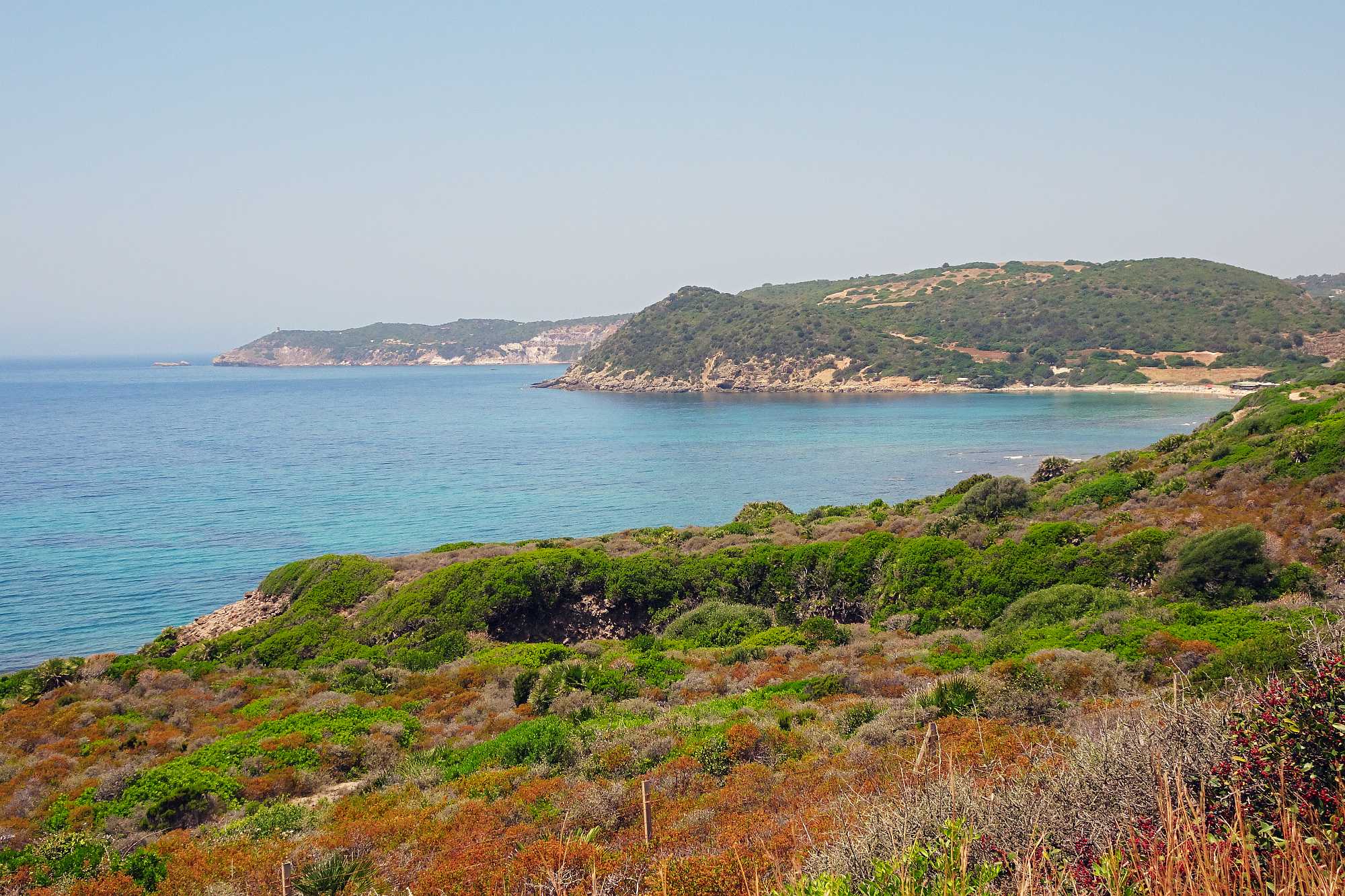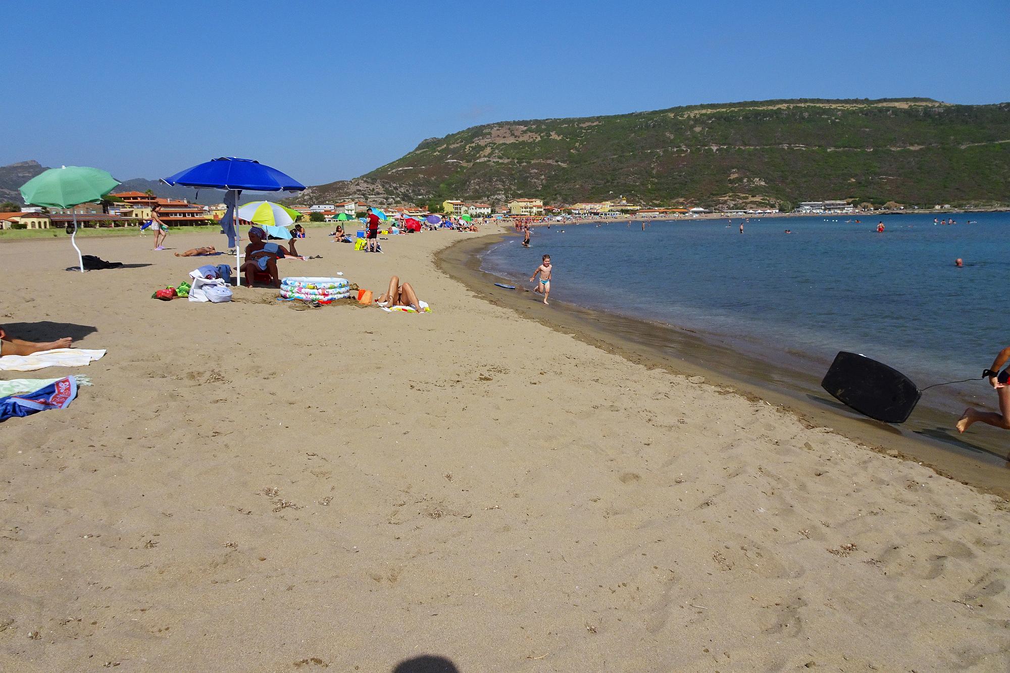 Nach einem Espresso ging es dann hinunter in die Ebene, eine etwas eintönige Landschaft, die allerdings so etwas ist wie der grüne Garten Sardiniens, und die wir auf der SS131 rasch hinter uns brachten. Bei Uras verließen wir die schnurgerade Schnellstraße und auf kleinen Seitenstraßen – die allerdings fast alle immer gut in Schuss waren – schlängelten wir uns zur berühmten Costa Verde. Hier handelt es sich wohl um so etwas wie den Hotspot der Wohnmobilisten, parken und campieren direkt an der Küste ist hier überall problemlos möglich.