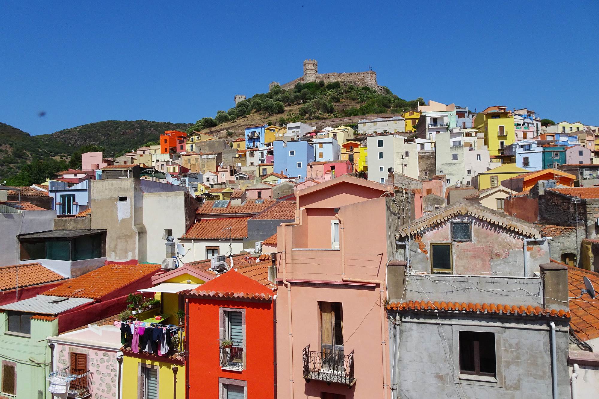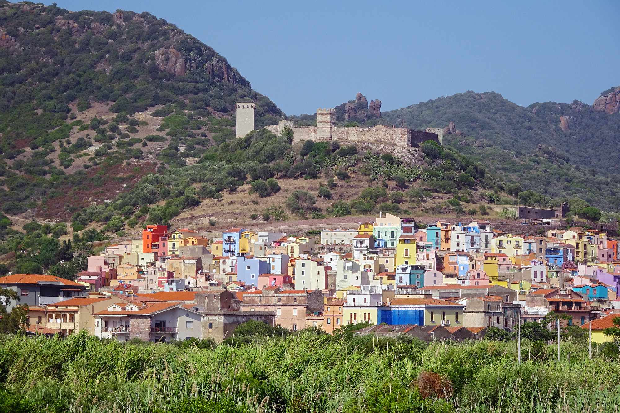 In Bosa angekommen waren wir überrascht vom Flair des Ortes: wunderhübsch an der Flanke eines Hügels gelegen, bunte mehrstöckige Häuschen, eine gemütliche Fußgängerzone und jede Menge Bars und Restaurants – was man sich in Sardinien nicht überall erwarten kann. Absolut lohnend, wenn auch anstrengend, war der Besuch der am Gipfel des Hügels gelegenen Burgruine mit Aussicht über den Ort und das gesamte Flußtal.