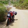 Die Weiterfahrt gestaltete sich dann etwas tricky, denn um am südlichen Ende der Costa Verde wieder ins Innenland und auf eine Hauptstraße zu gelangen, mussten wir erst mal einen Bach bzw. eine Furt durchqueren. Das Problem dabei: am Ende der Furt ist der Sand so weich, dass man gleich mal mit dem Vorderrad versinkt. Und auch die „Straße“ selbst war abenteuerlich genug. Für Enduros alles kein Problem, mit Straßenmotorrädern geht’s mit mehr Schweiß und Anstrengung freilich auch. :-)