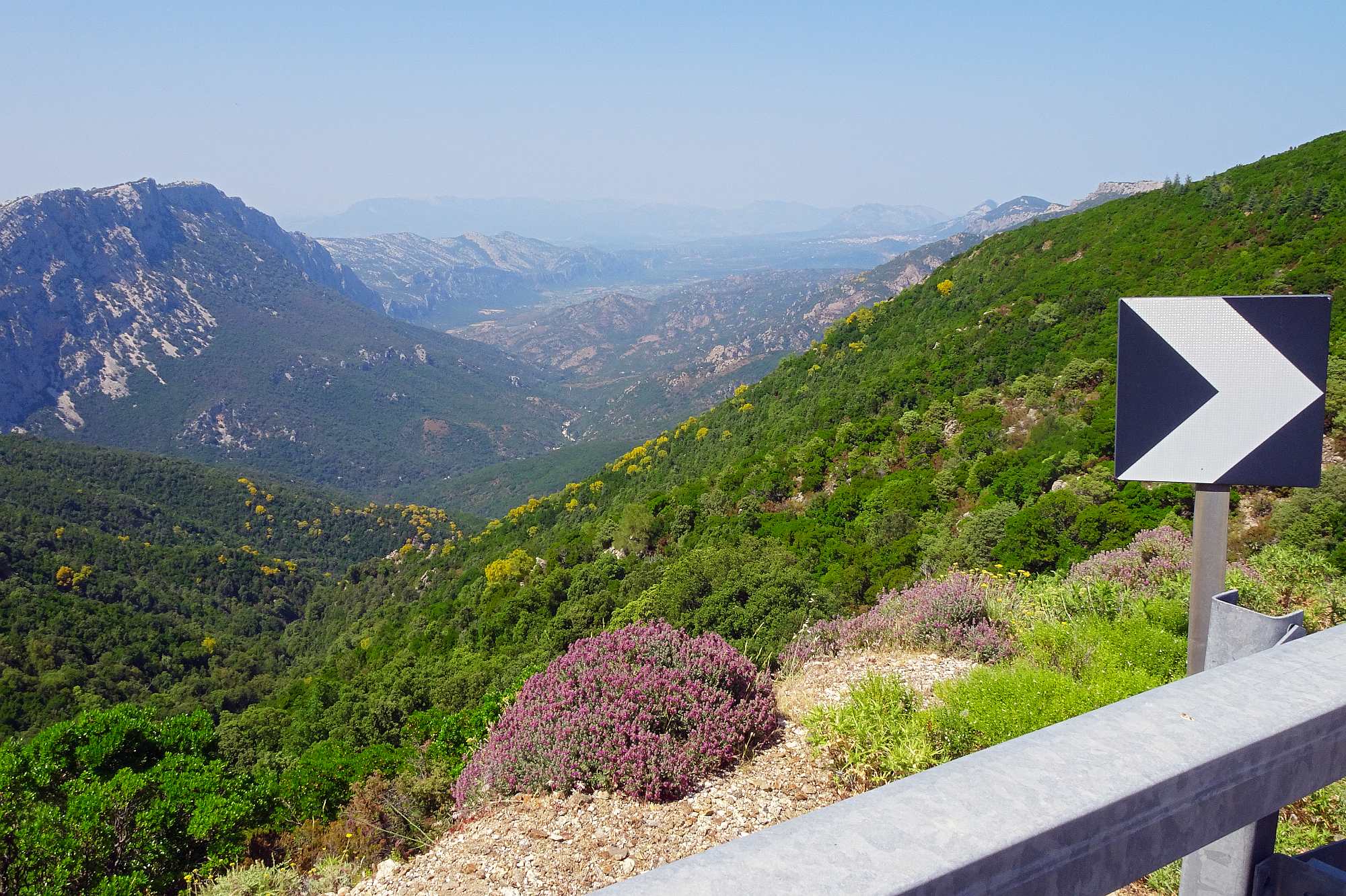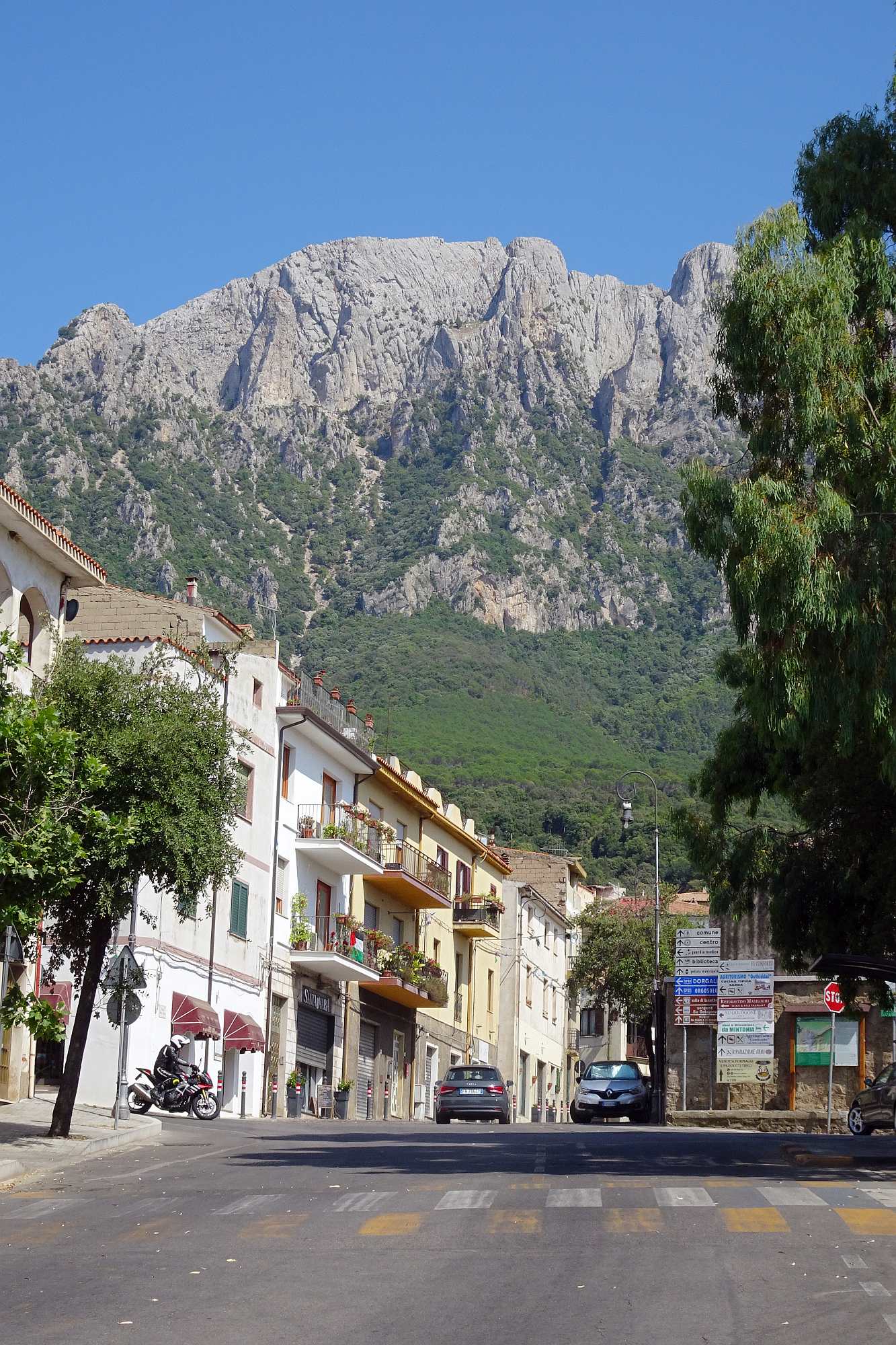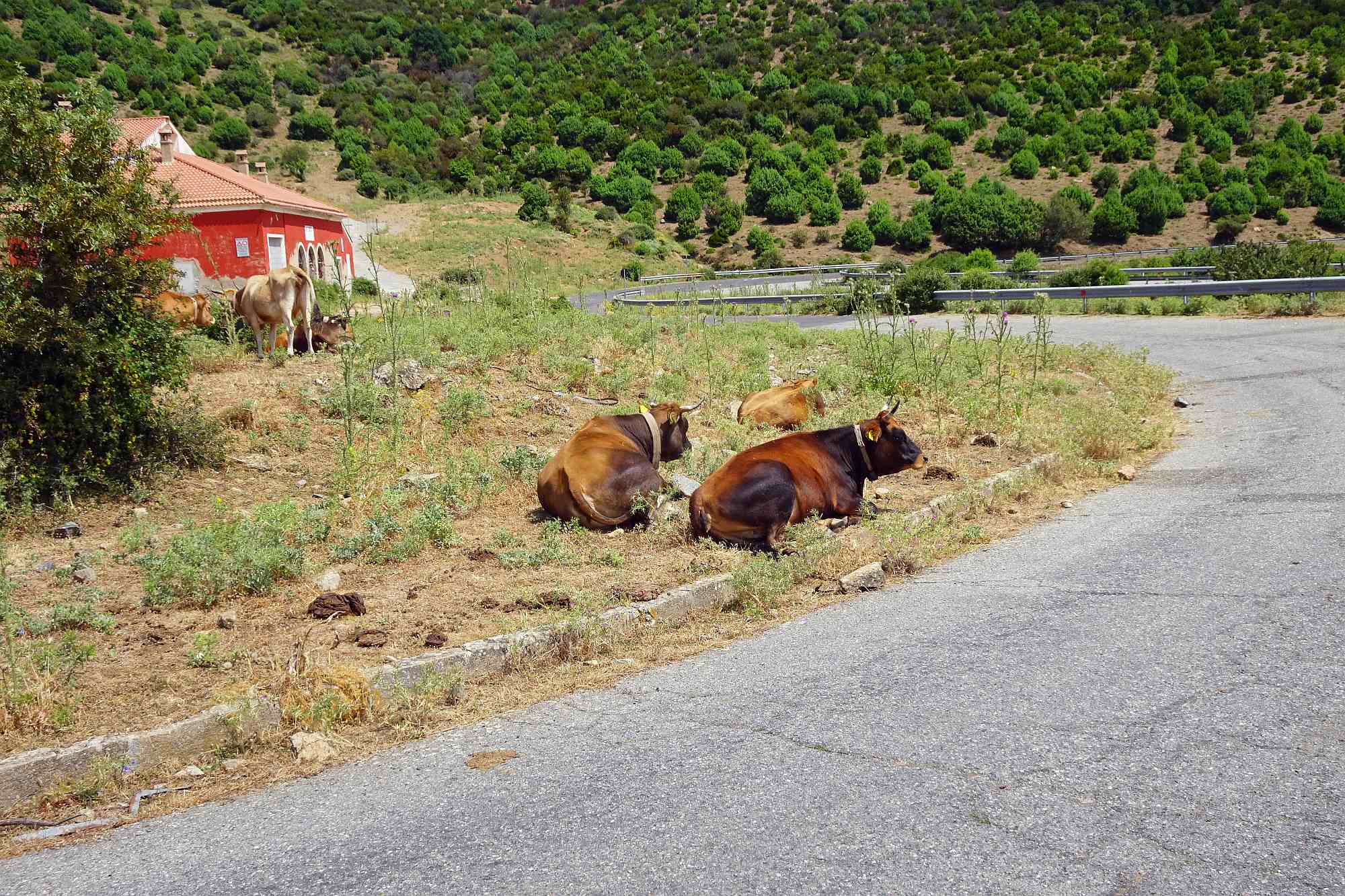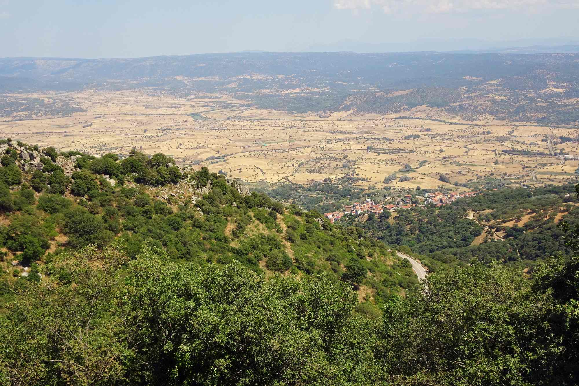 Anschließend gewannen wir rasch an Höhe, was auch dringend notwendig war, die Temperaturen zur Mittagszeit waren ja schon wieder kaum auszuhalten. Wir streiften ein paar kleine Örtchen, wollten aber nicht schon wieder anhalten, schließlich versprachen die Berge kühle Temperaturen und Kurvenfeeling. Bis auf circa 1.100 Meter schlängelte sich die Straße durch den Gennargentu, eine Kurve nach der anderen auf wunderbarem Asphalt.