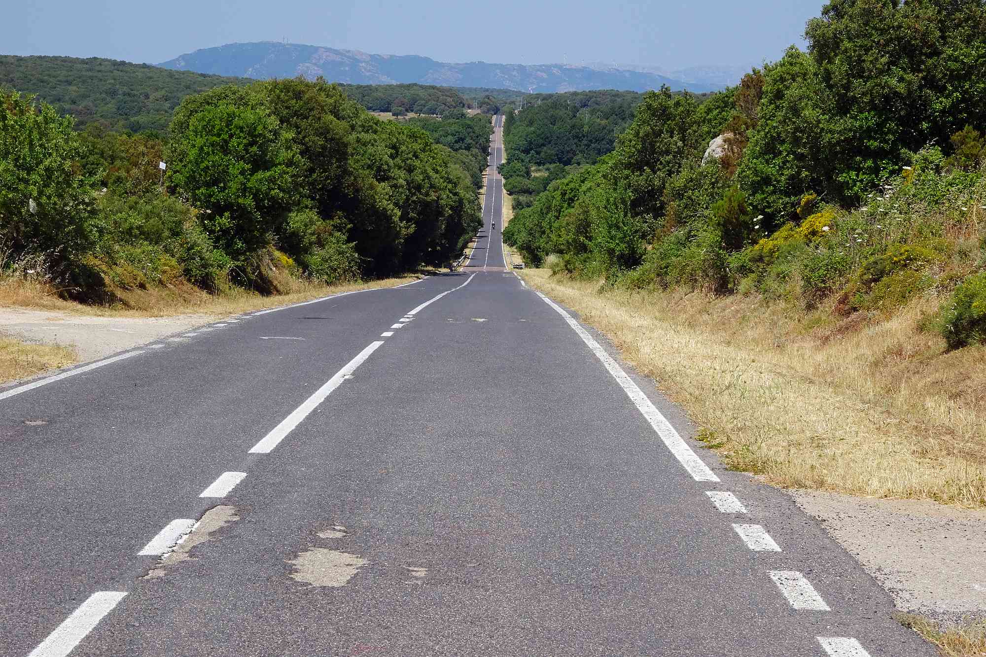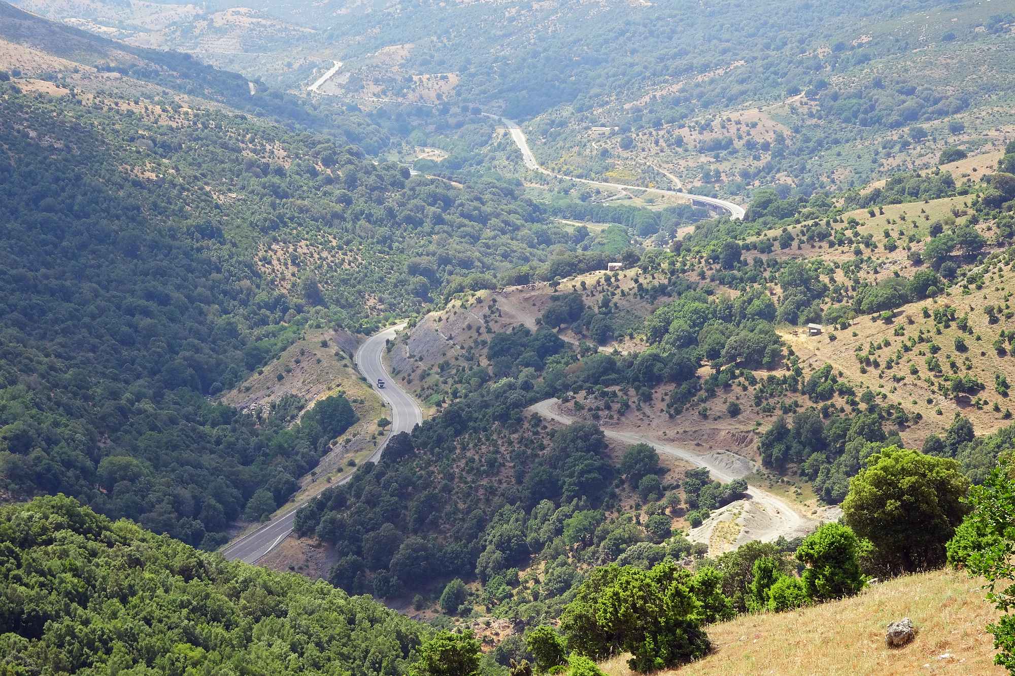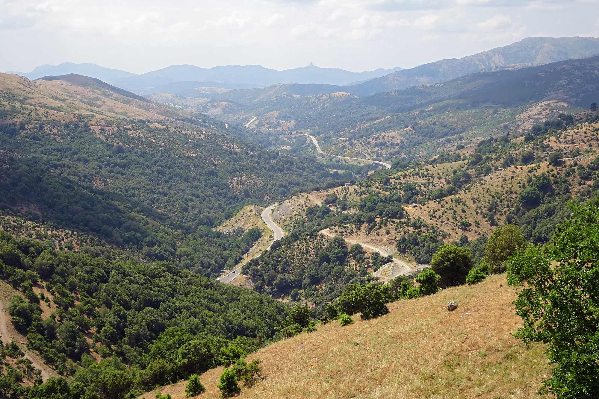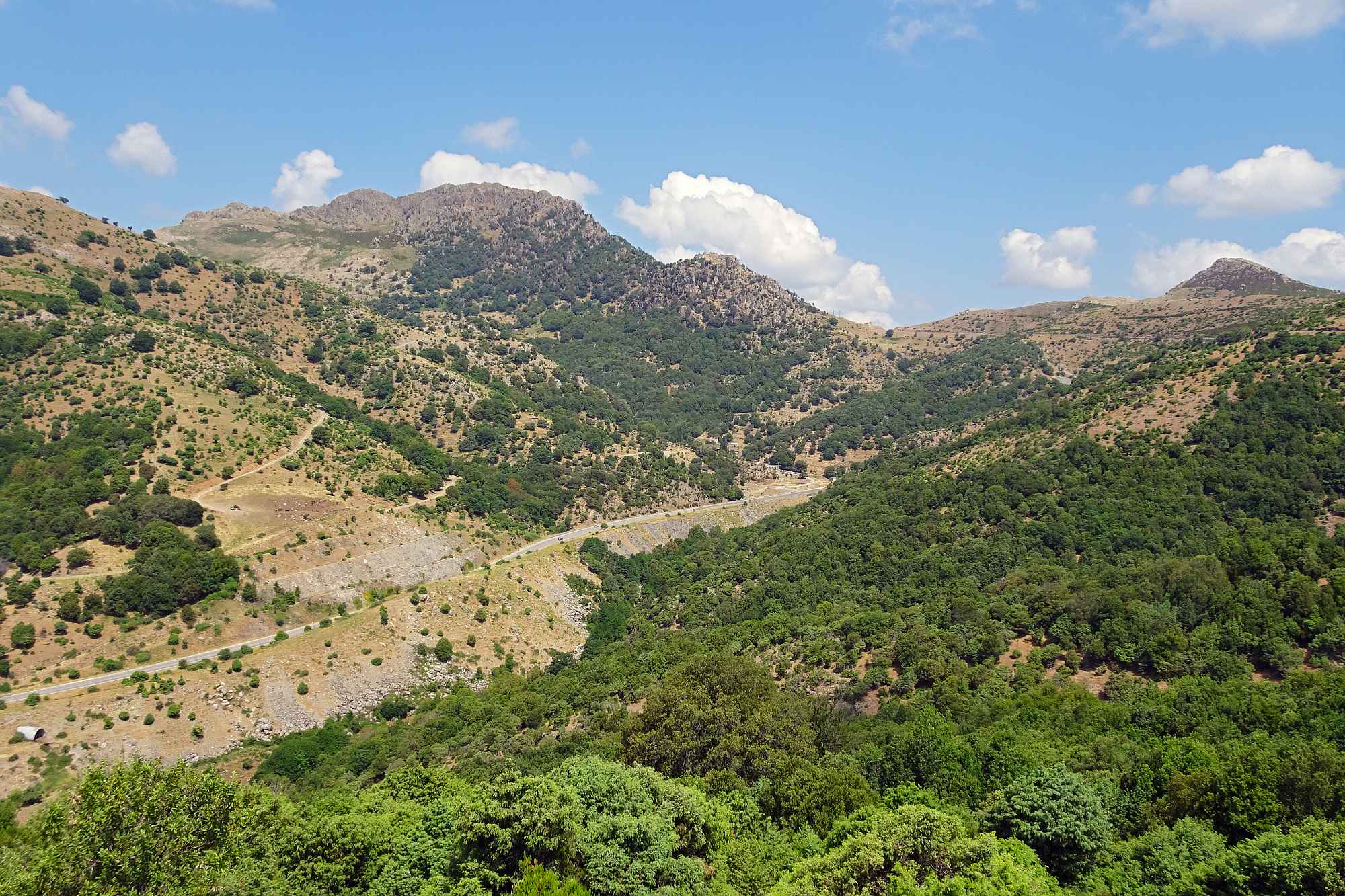 Anschließend gewannen wir rasch an Höhe, was auch dringend notwendig war, die Temperaturen zur Mittagszeit waren ja schon wieder kaum auszuhalten. Wir streiften ein paar kleine Örtchen, wollten aber nicht schon wieder anhalten, schließlich versprachen die Berge kühle Temperaturen und Kurvenfeeling. Bis auf circa 1.100 Meter schlängelte sich die Straße durch den Gennargentu, eine Kurve nach der anderen auf wunderbarem Asphalt.