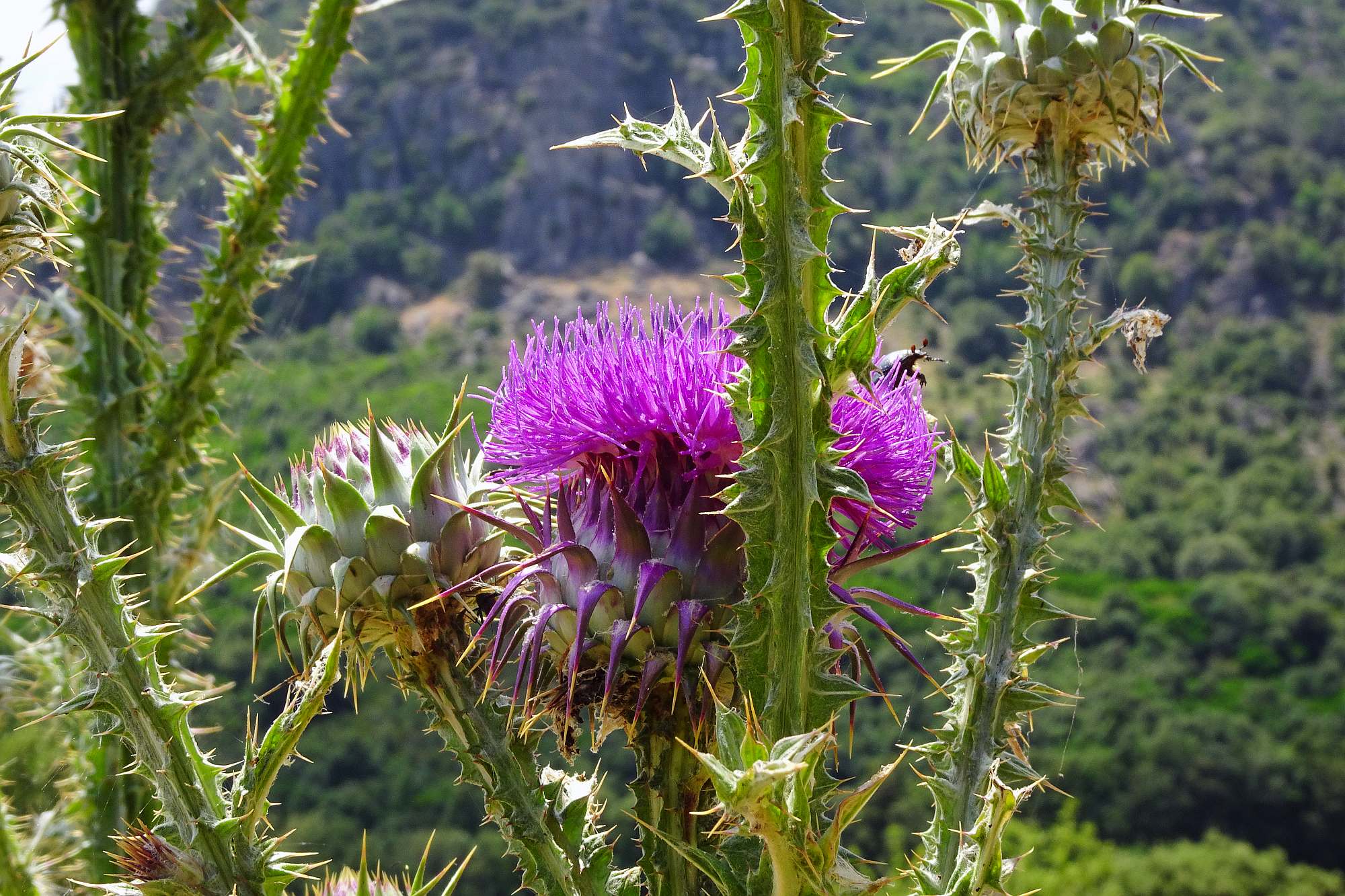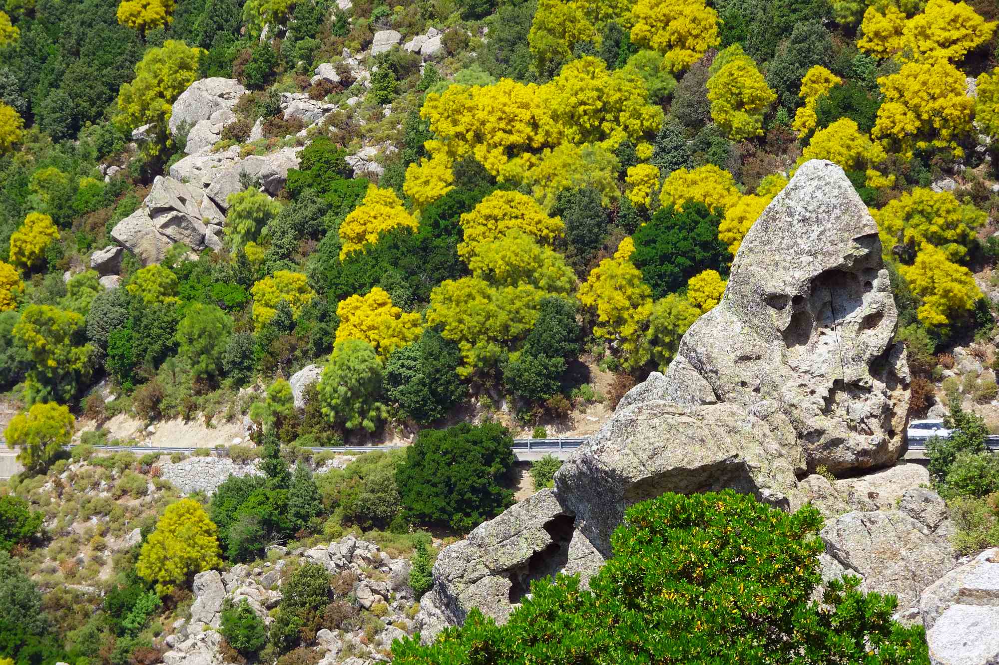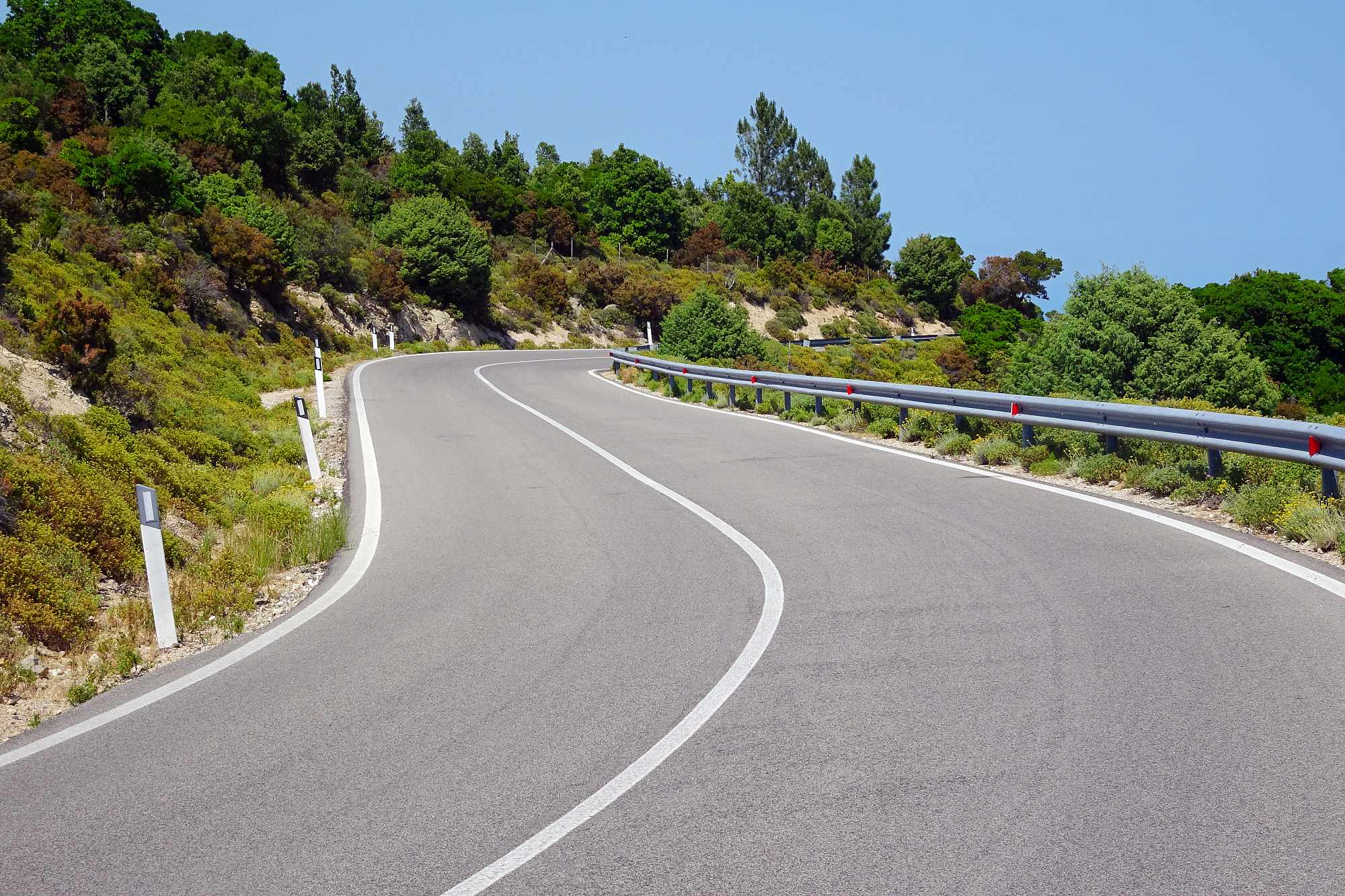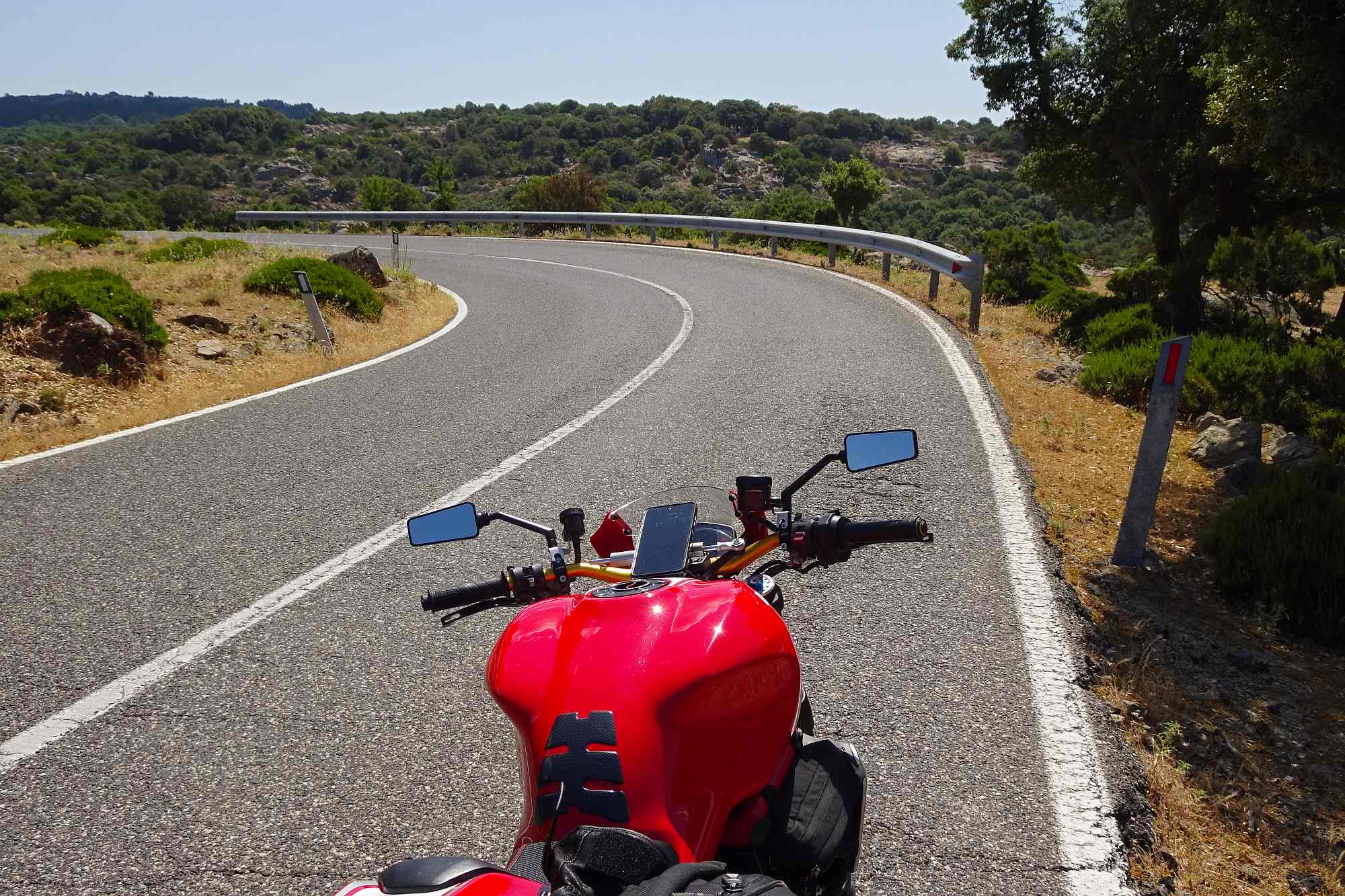 Anschließend gewannen wir rasch an Höhe, was auch dringend notwendig war, die Temperaturen zur Mittagszeit waren ja schon wieder kaum auszuhalten. Wir streiften ein paar kleine Örtchen, wollten aber nicht schon wieder anhalten, schließlich versprachen die Berge kühle Temperaturen und Kurvenfeeling. Bis auf circa 1.100 Meter schlängelte sich die Straße durch den Gennargentu, eine Kurve nach der anderen auf wunderbarem Asphalt.