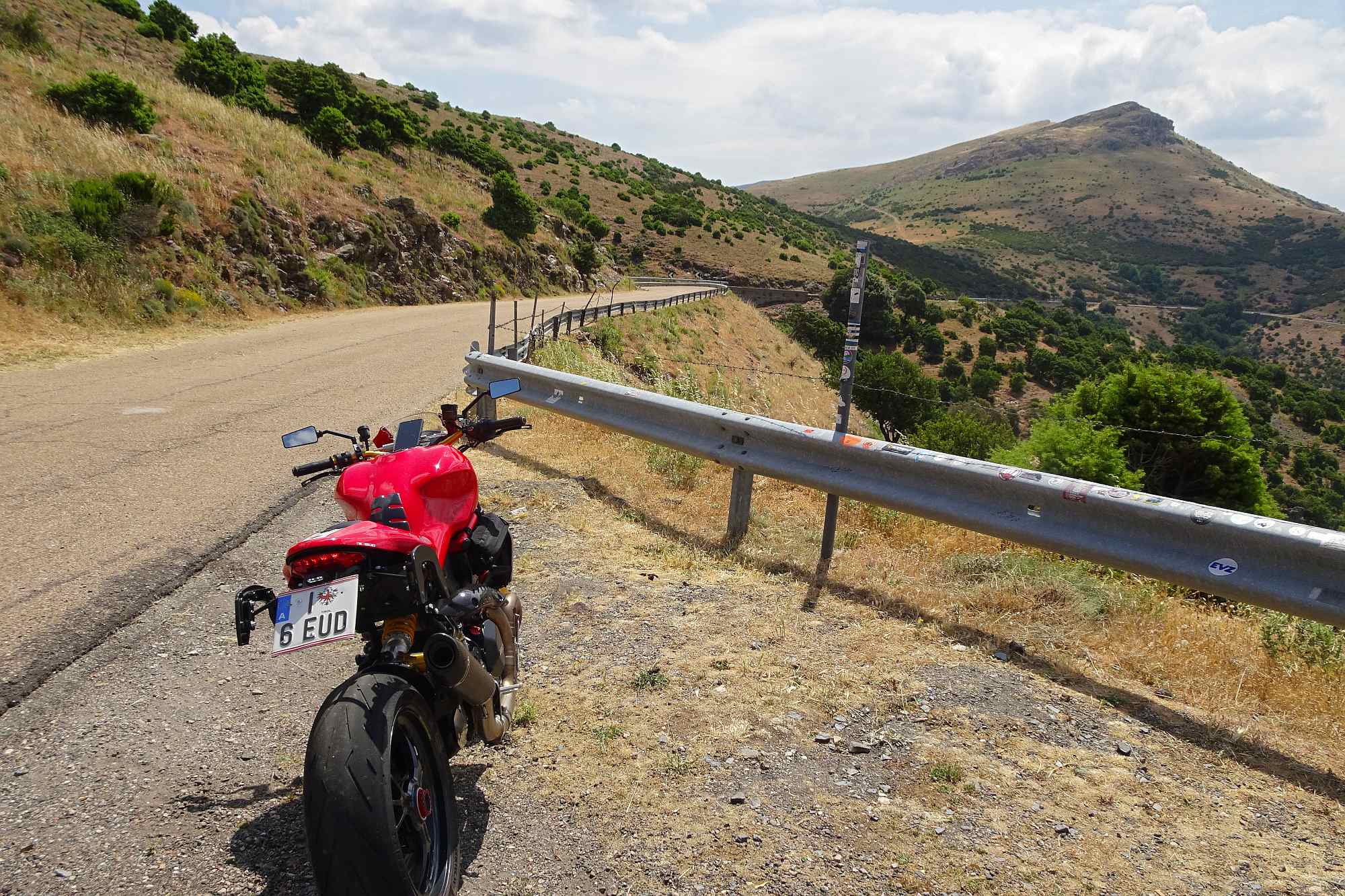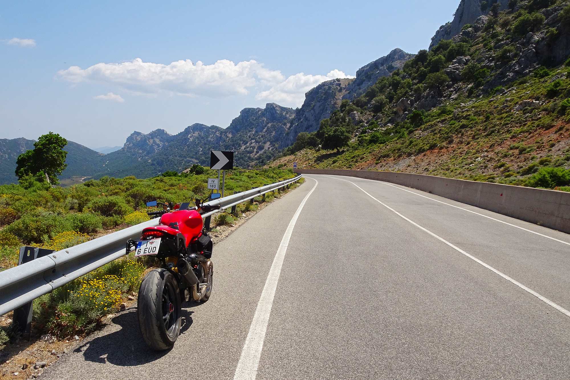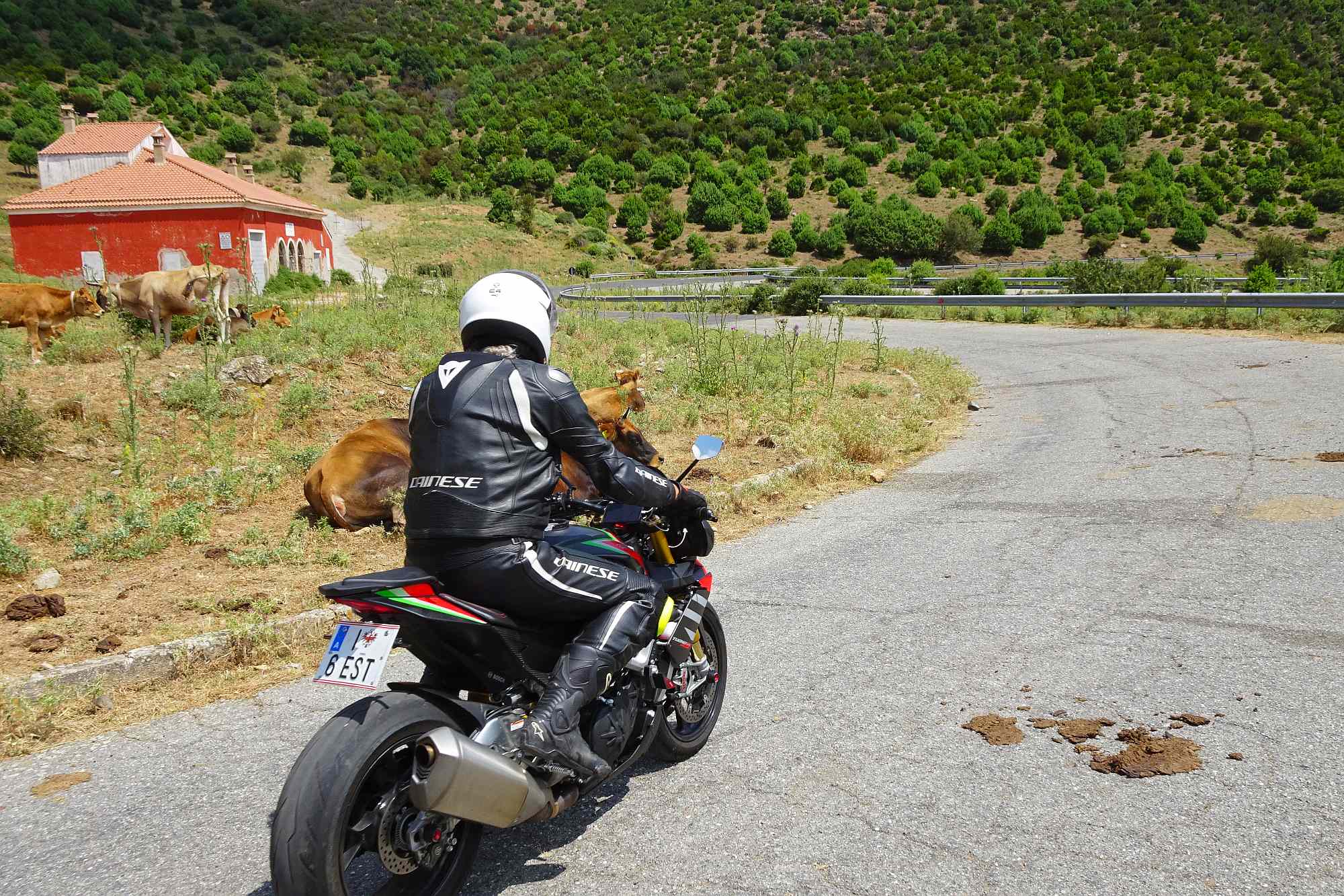 Noch ein letztes Mal begaben wir uns auf die Reise durch die wunderbaren sardischen Berge. Zuerst natürlich wieder runter vom Hotel nach Oliena. Von hier aus gab’s schon mal das erste Highlight. Die Straße SS389 nach Buddu ist ein wahrer Hit. Gleichmäßige Kurven, guter Radius, übersichtlich, top Asphalt – einfach super. Und auch die Temperaturen hielten sich in diesem hügeligen Gelände in Grenzen.